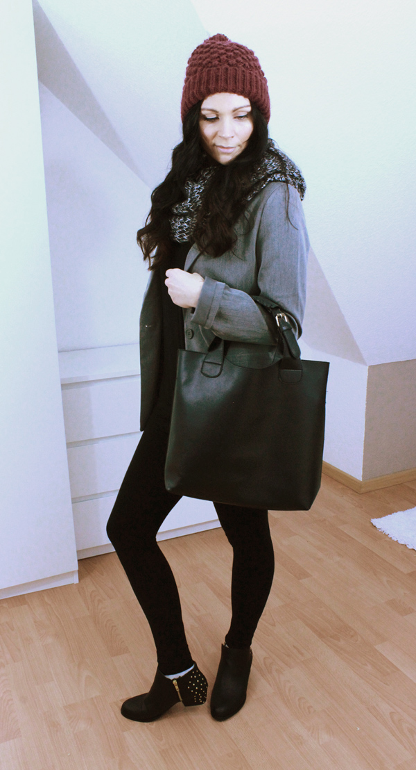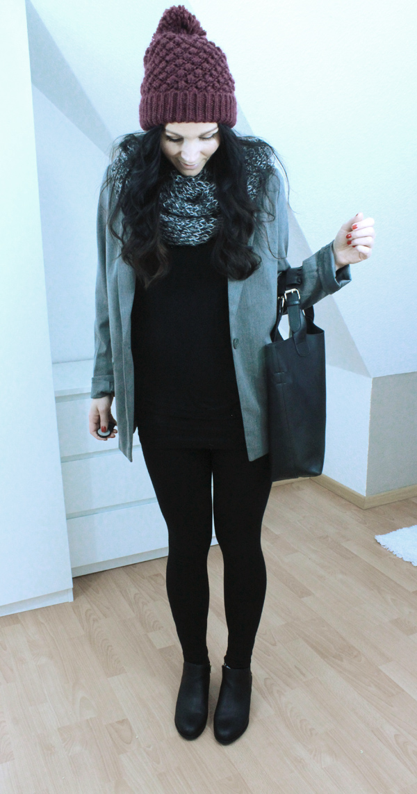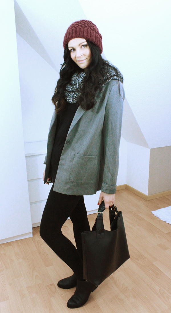 Todays outfit of the day impresses with a woolen hat by Zara. It’s presented by burgundy claret red colors. I love the hat, i compare it with a series of outfits. It’s everytime a massive eye-catcher. The zara wollen hat is combined with grey sprinkled blazer by H&M. The blazer is an older one, but i’m still in love with him. Thereunder i wear a casual sweatre by zara in black. The leggings and boots are booth by H&M. The boots are my daily companion since a few month. The handbag is a noname product, which i owned due ebay.