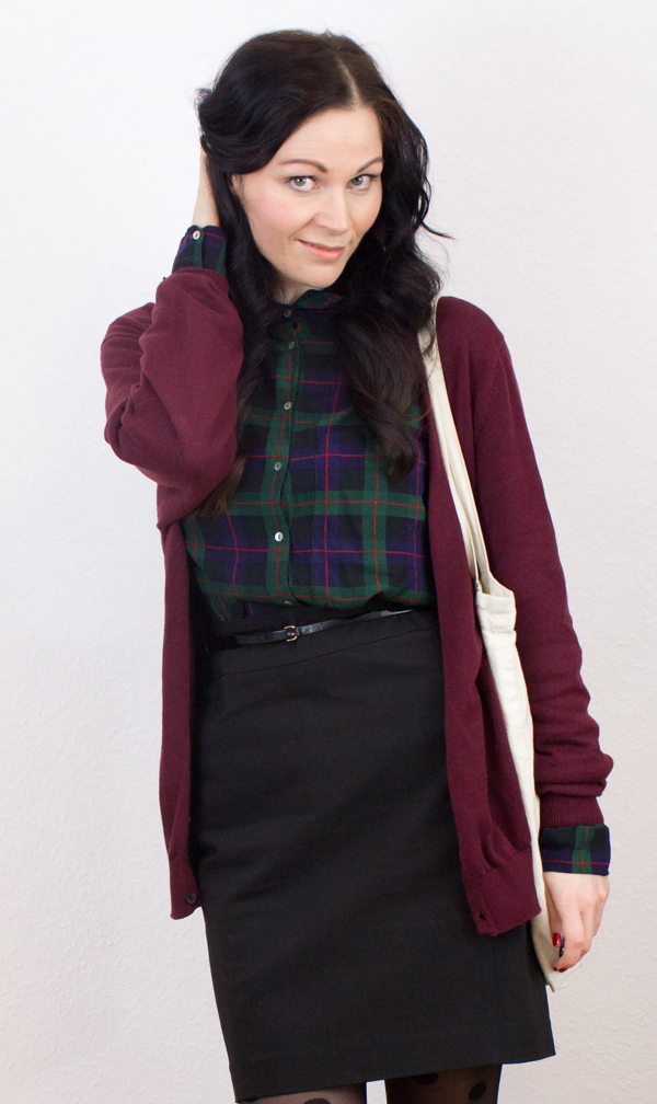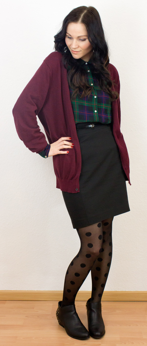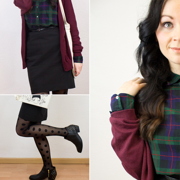 Die Strumpfhose mit den Trend-Punkten habe ich letzten Winter bei H&M gekauft. Der Rock ist ebenfalls vom Schweden und noch aktuell im Sale zu finden. Er ist super bequem und inspiriert mich zu zahlreichen zukünftigen Outfitkombinationen. Der Jutebeutel, auch von H&M, wurde in der hintersten Ecke des Kleiderschrankes wieder entdeckt. Dazu habe ich meine karierte Zara Hemdbluse kombiniert, die ich vor einiger Zeit bereits hier vorgestellt habe. Da es doch zur Zeit etwas kühl ist, benötigte ich noch einen farblich passenden Cardigan. Fündig wurde ich im Schrank meines Freundes, der genau das passende Stück auf der Stange hatte.