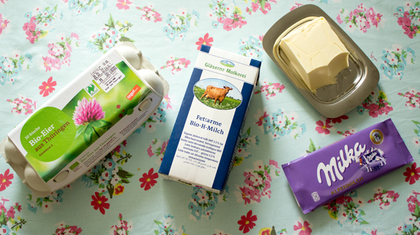 4. Eier, Milch und Butter in einer zweiten Schüssel verrühren. Anschließend die Eimasse zur Mehlmischung geben und mit dem Schneebesen oder einem Kochlöffel solange verrühren, bis alle Zutaten feucht sind. Als nächstes die Schokolade unterheben.