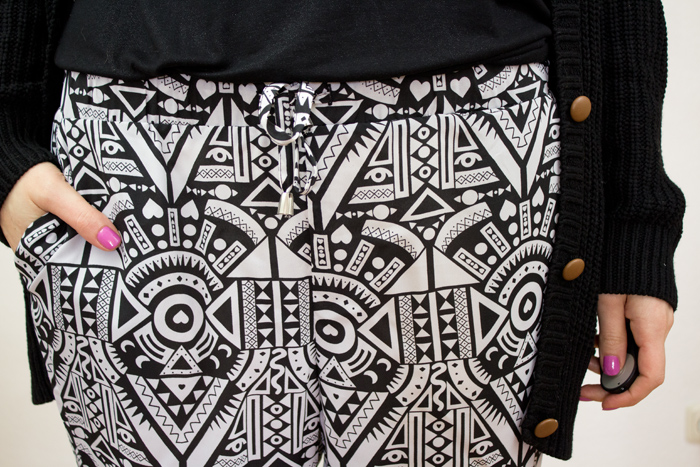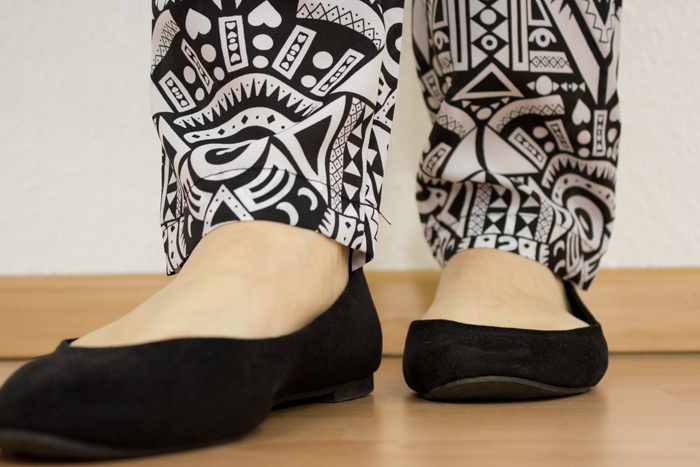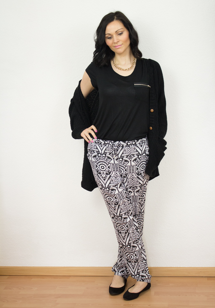 Wie kombiniere ich das Formenmuster: Weil meine Hose im Ethno –Print schon auffällig genug ist, habe ich mich für ein schlichtes schwarzes Shirt entschieden. Zusätzlich trage ich noch einen schwarzen Cardigan, falls die Temperaturen unverhofft purzeln. Ich bin gewappnet!