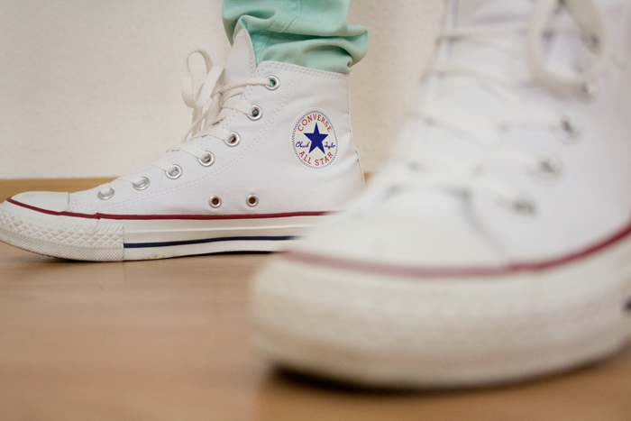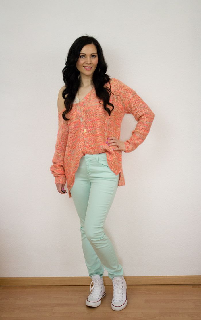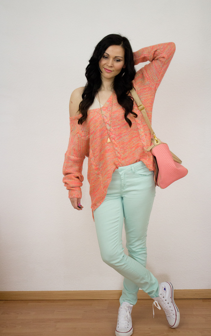 Fast schon dezent wirkt dagegen meine Jeans in der schönen Farbe Mint! Kombiniert habe ich diese mit meinen weißen Converse Sneakers und einer rosanen Tasche.