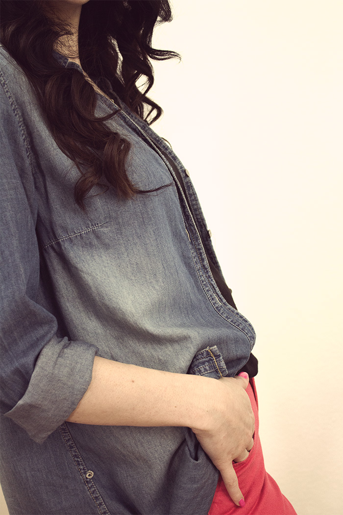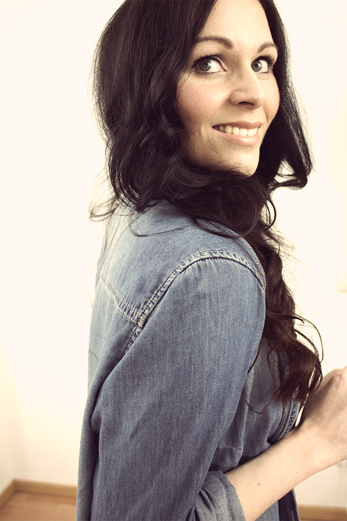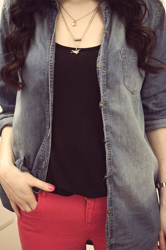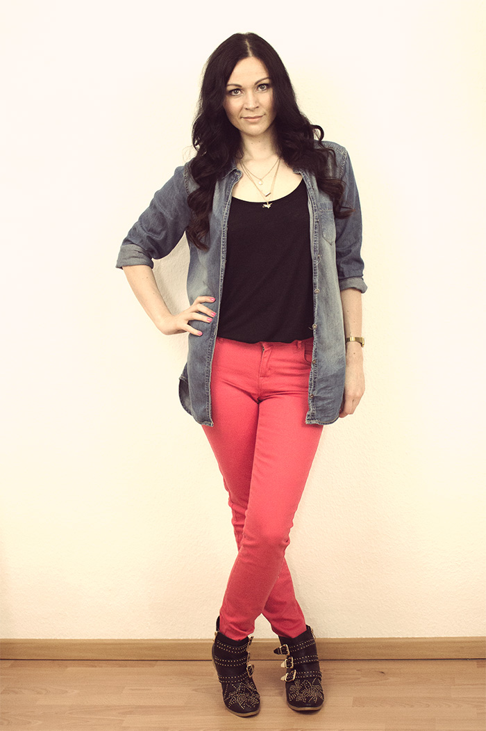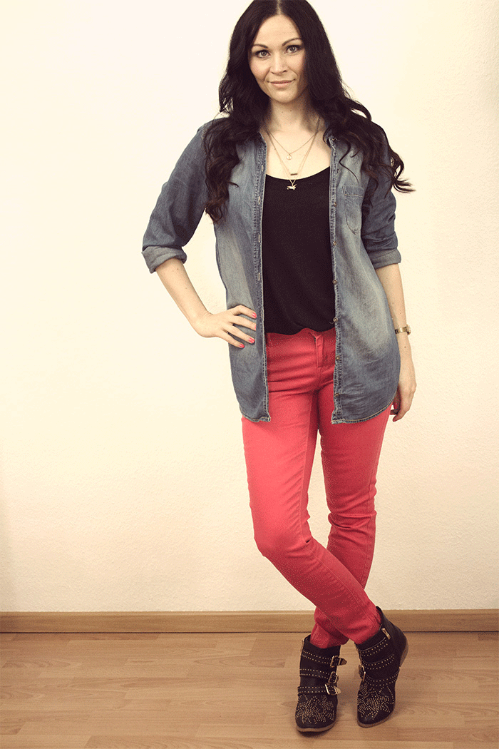 Kombiniert habe ich die auffällige rote Hose mit einem dezenten schwarzen Shirt. Darüber trage ich ein Jeanshemd, bei den aktuellen Temperaturen die richtige Entscheidung. In der Schuhwahl bin ich spontan und trage diese je nach Wetterlage offen oder geschlossen, in Form von Ballerinas, Pumps oder Nieten-Boots.