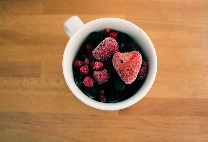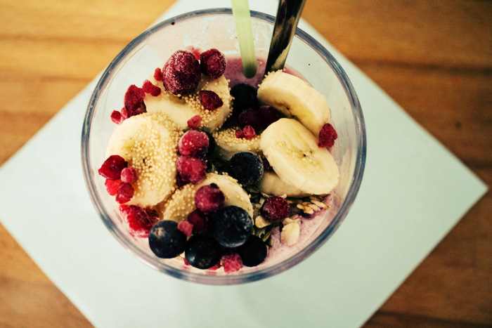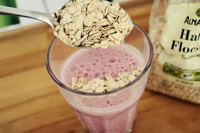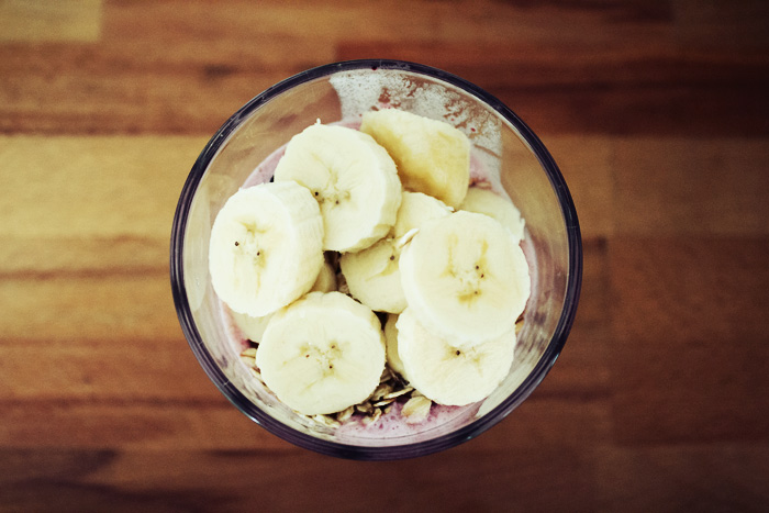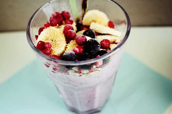 Der Power-Shake schmeckt in unzähligen Variationen. Zum Beispiel mit Kirschen, Bananen, Himbeeren oder Heidelbeeren. Zusätzlich könnt ihr auch Vanille zugegeben.