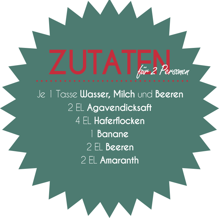 Wasser, Milch, Beeren und Agavendicksaft in einen Mixer geben und pürieren. Den Shake auf zwei Gläser verteilen. 2 EL Haferflocken in je ein Glas geben. Banane in Scheiben schneiden und auf die zwei Gläser verteilen. Zuletzt 1 EL Beeren und 1 EL Amaranth in je ein Glas geben.