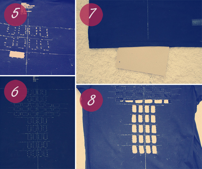 7./8. Nehmt die restliche Pappe wieder zur Hand und schiebt sie zwischen das T-Shirt. Dies verhindert das Schneiden in die Vorderseite des T-Shirts. Nun Könnt ihr mit dem Ausschneiden beginnen. Einfacher geht es wenn ihr die Rechteckte in der Mitte einschneidet.