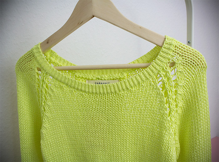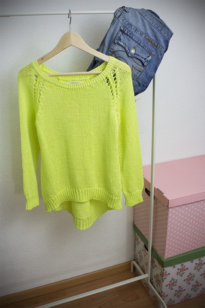 Regen, Regen, Dauerregen! Und was macht Frau bei diesem bescheidenen Wetter? Richtig, sie geht shoppen in der Hoffnung, dass der Sommer sich dann endlich zeigt. Gesagt, getan! Bewaffnet mit einem Regenschirm und Gummistiefeln hab ich mich auf den Weg in die Erfurter Innenstadt gemacht, um neue Inspirationen zu finden, zu bummeln und einen Milchkaffee im Klara Grün zu genießen. Letzteres ist ein kleines, aber feines faire trade Kaffee. Ein kleiner Geheimtipp, falls ihr mal in der Nähe seid. Gefunden habe ich auch etwas: den neon-gelben Sweater von Zara.