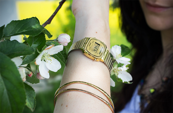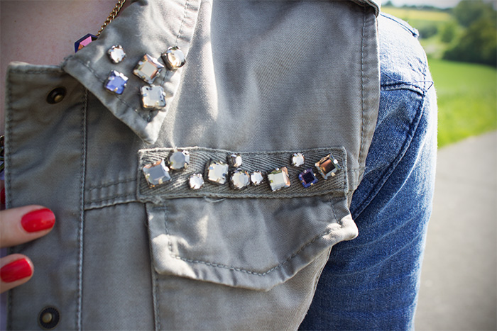 Shirt, Jeansbluse, Weste, Hose, Kette, Ballerinas von H&M; Armreifen von Fossil, Uhr von Casio, Nagellack Fifth Avenue von Essie, Lippenstift Freckletone MAC.