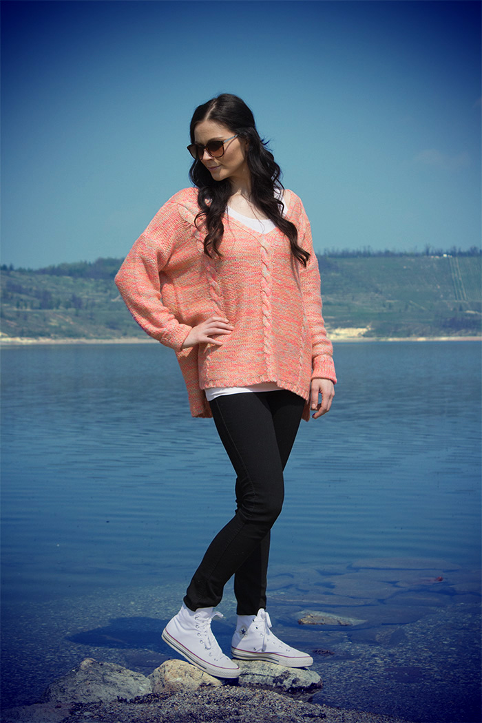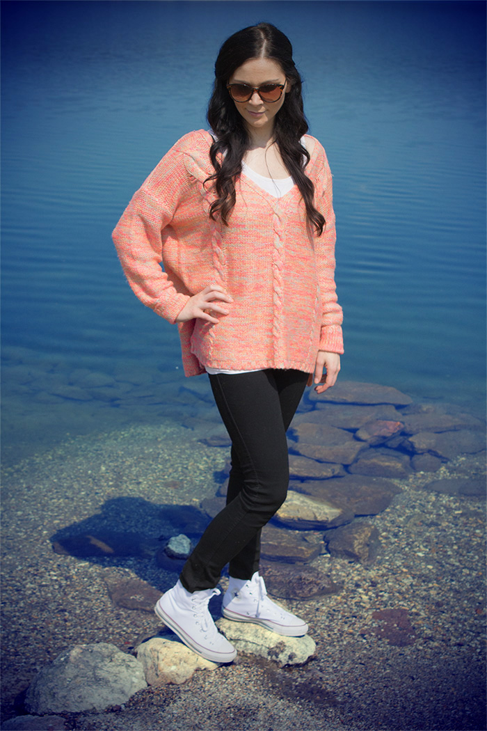 Wie ihr unschwer erkennen könnt, bin ich dem Neon-Trend verfallen. Auf den Nägeln, an den Beinen und am Oberkörper sowieso – nichts ist sicher vor den knalligen Farben. Die Farbauswahl im Neonbereich ist zum Glück riesig – es darf wild gemixt werden. Immer wieder entstehen neue Looks die Lust auf Frühling und Sommer machen. Nicht verwunderlich, dass ich zu diesem Neon-Oversize-Sweater gegriffen habe. Die Kulisse ist traumhaft, mein heutiges Outfit eher schlicht. Heute wurden die intensiven Neonfarben dezent eingesetzt. Der Rest meines Outfits ist eher schlicht in Schwarz/Weiß gehalten.