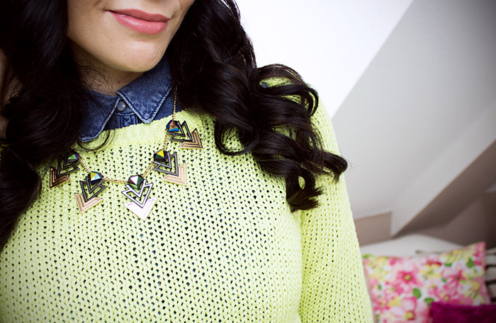 Ich trage einen neongelben Pullover mit Lochmuster, ein blaues Jeanshemd, eine schwarze Jeans mit Reißverschluss am Fußteil und eine Statementkette.