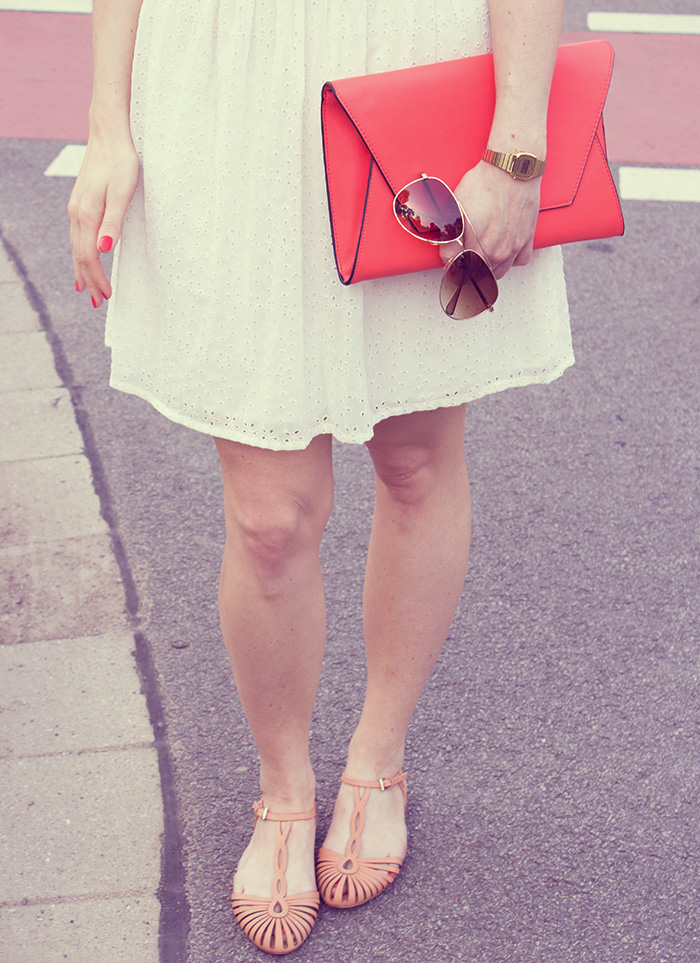 Kleid von ZARA, Tasche von ZARA, Sandalen von ZARA, Sonnenbrille von Gina Tricot, Uhr von Casio, Nagellack Meet Me At Sunset von Essie, Lippenstift Freckletone von MAC.