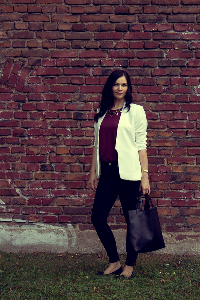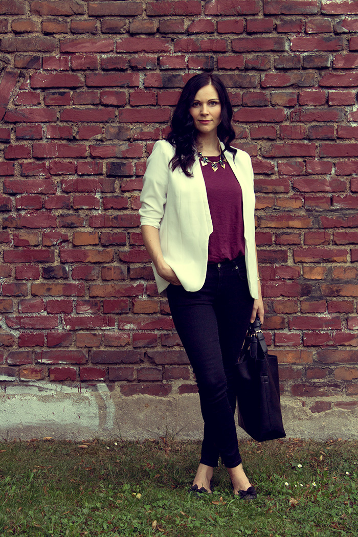 // blazer: H&M // necklace: H&M // shirt: H&M // jeans: GINA TRICOT // shoes: H&M // bag: EBAY // watch: CASIO // lipstick MAC – twig //