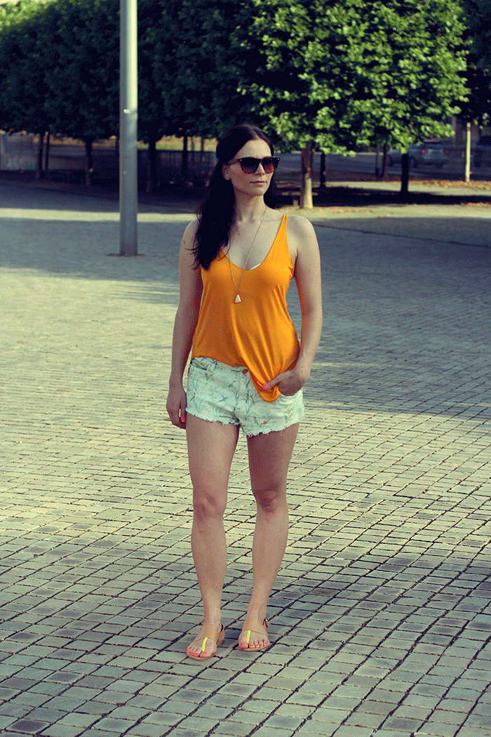 Das neon-orange High-Low-Top harmoniert außerordentlich gut mit der Print-Short und greift dezent gesetzte Orangetöne auf. Die Kette von Pieces schafft einen kleinen pastellfarbenen Akzent auf dem unifarbenen Neon-Top. An den Füßen trage ich meine derzeitigen Lieblingssandalen mit neongelben Highligts. Abgerundet wird meine Outfitkombination mit dem Neon-Lack „camera“ von Essie.