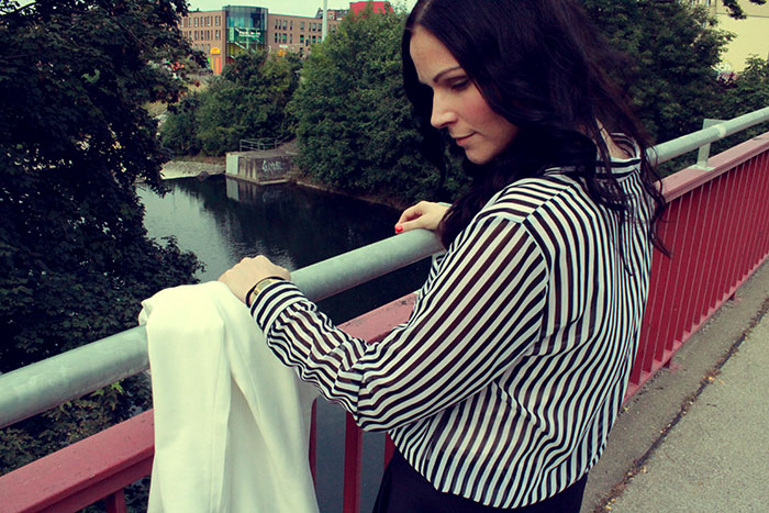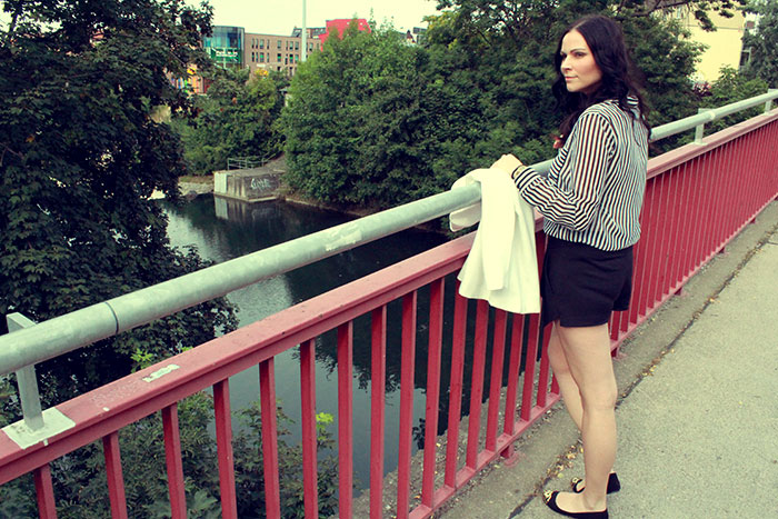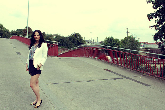 Die Bluse, der Hosenrock und die Schuhe sind von Zara. Der Blazer ist von H&M und die Uhr von Casio. Hosenrock und Blazer sind aktuell. Der Rest ist leider schon älter.