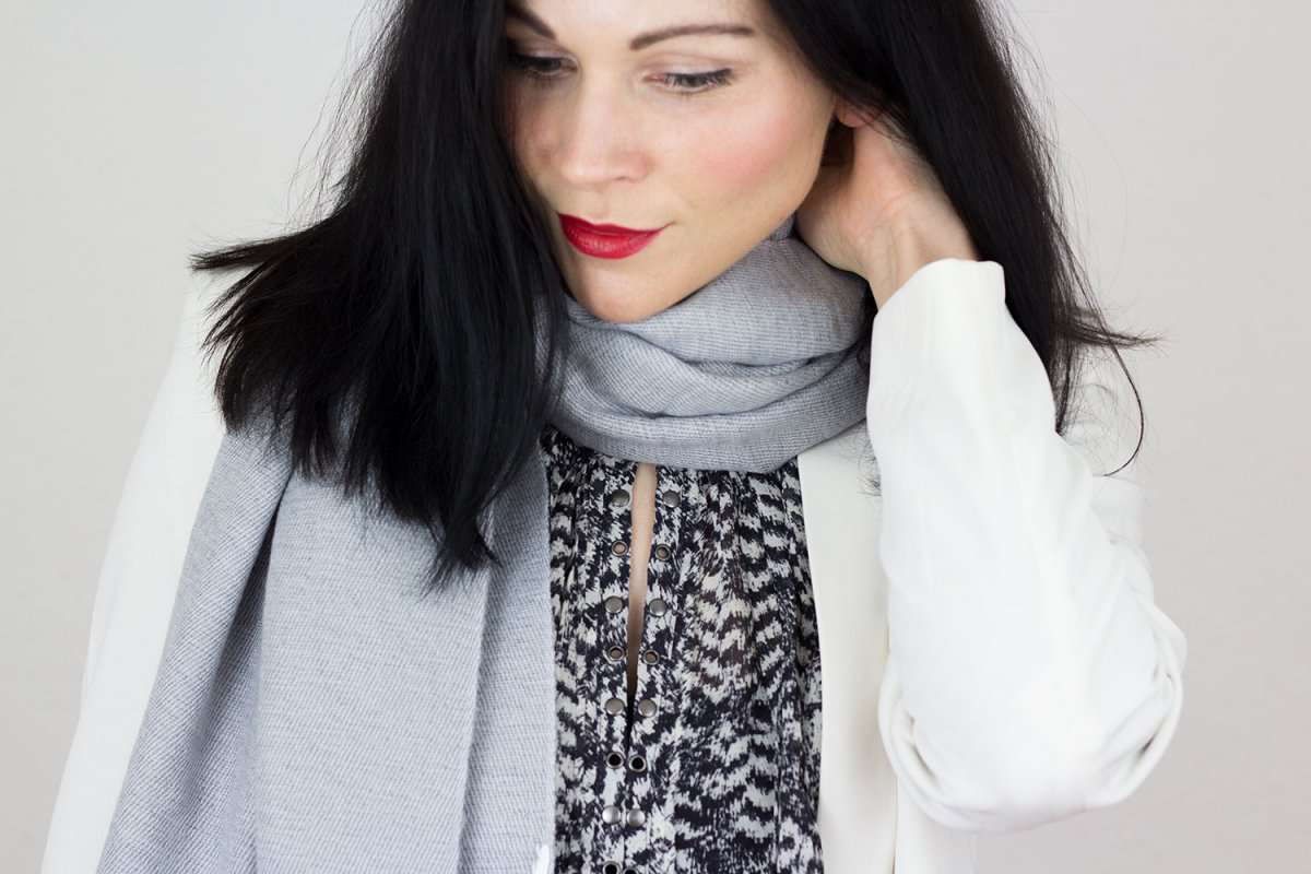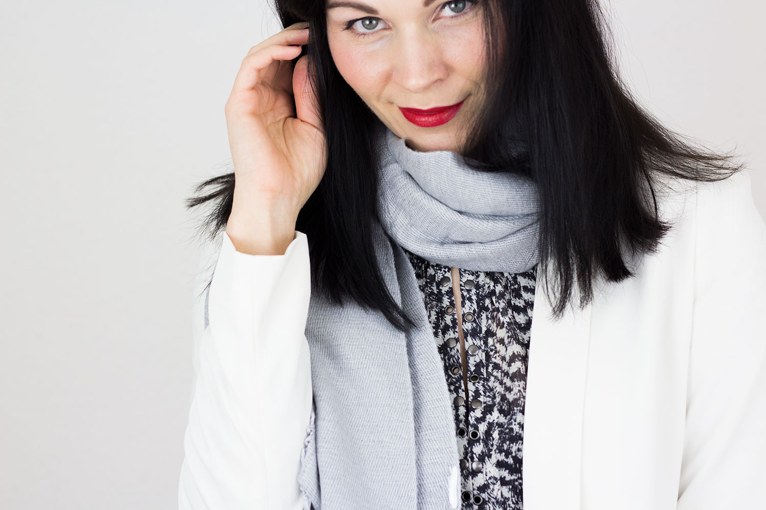 Doch ganz Monochrom ist mein Look dann doch nicht geworden. Denn auf den Lippen trage ich an mausgrauen Tagen besonders gerne die Farbe Rot.
