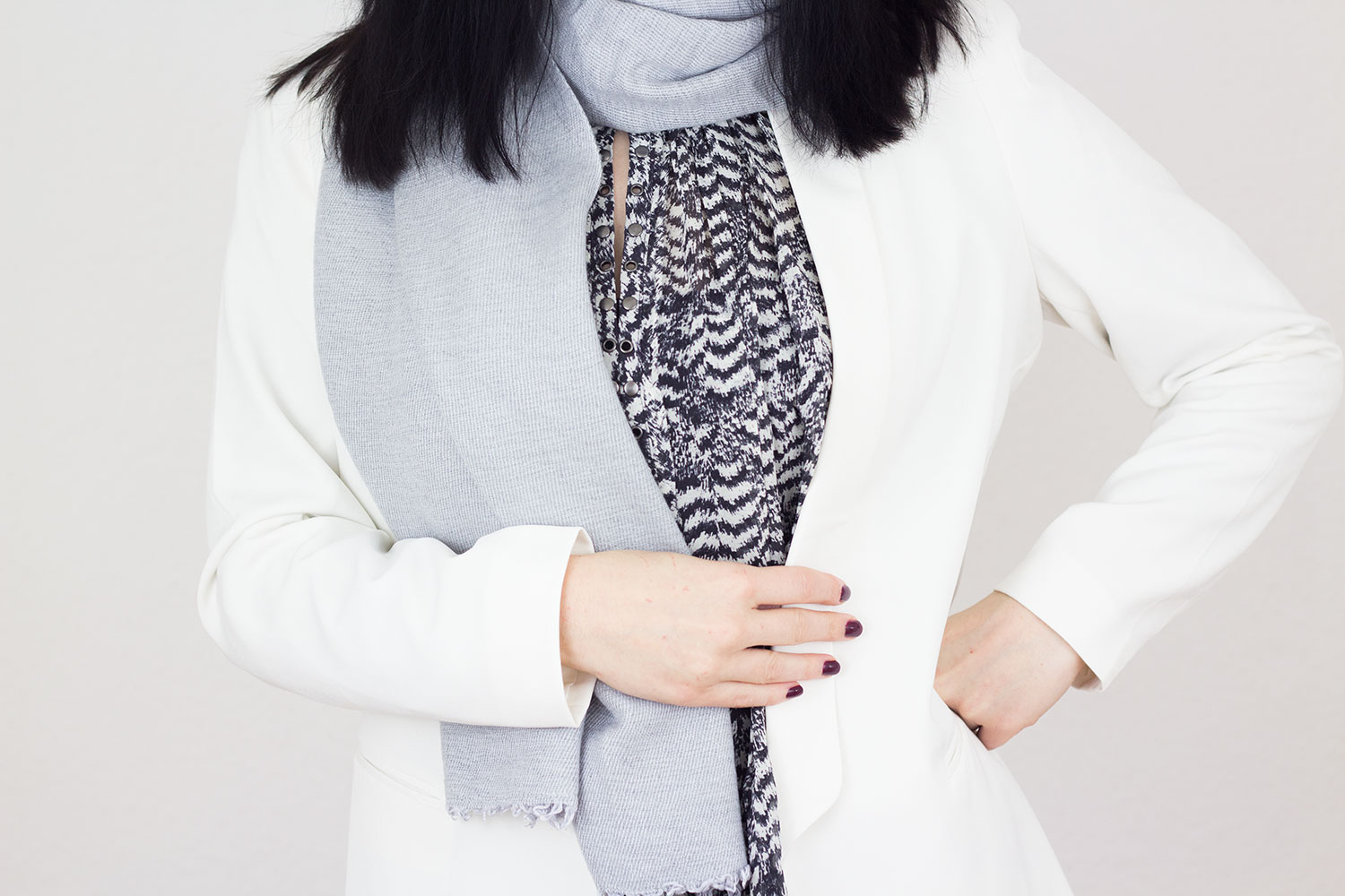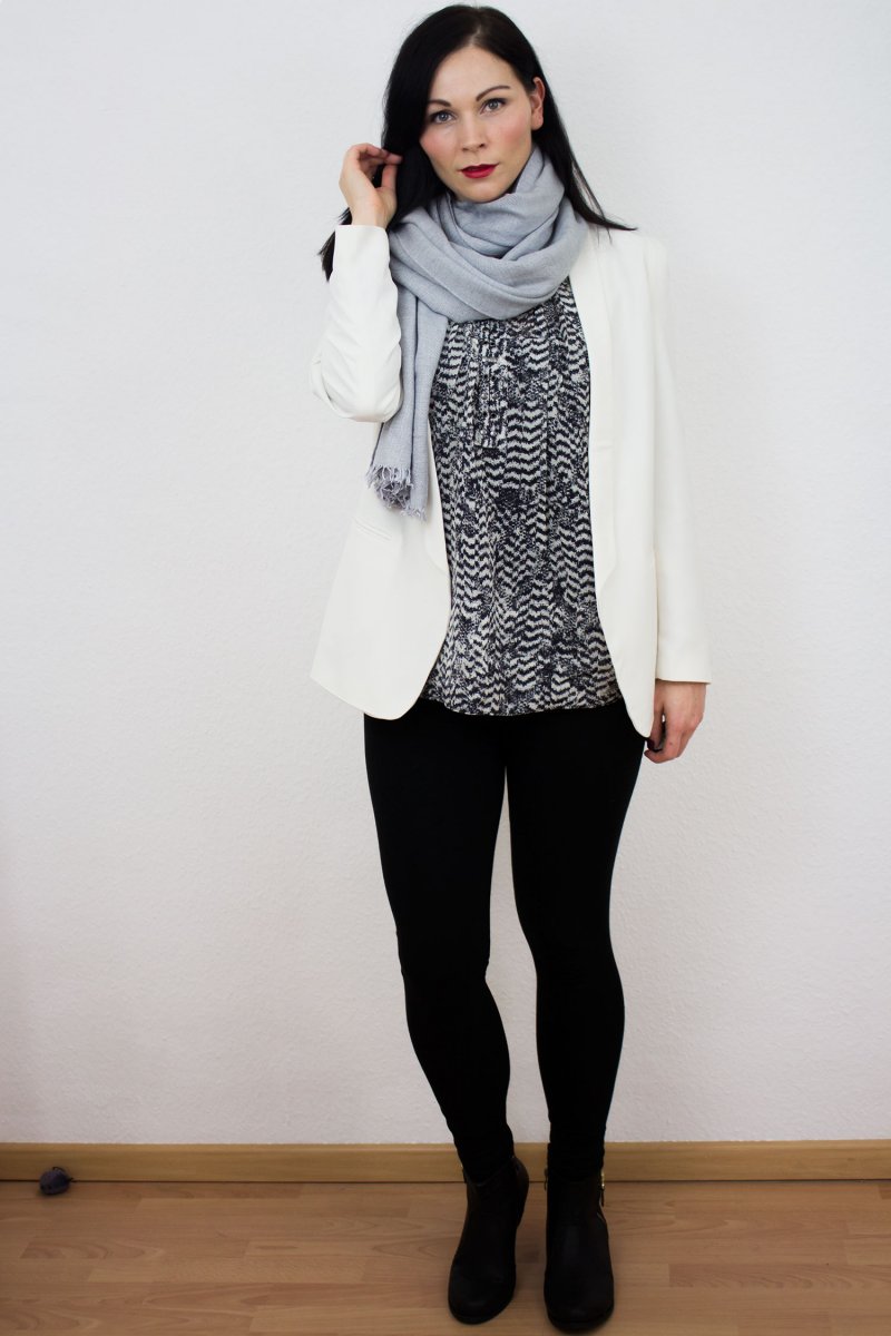 Erleuchtend wirkt auf jeden Fall mein weißer Boyfriend Blazer, der das Weiß der Bluse aufnimmt und dennoch dezent im Hintergrund erscheint. An den Beinen hingegen wird es düster, denn ich trage schwarze Leggings. Diese strecken meine Beine optisch und sind die beste Wunderwaffe an regnerischen Wintertagen.
