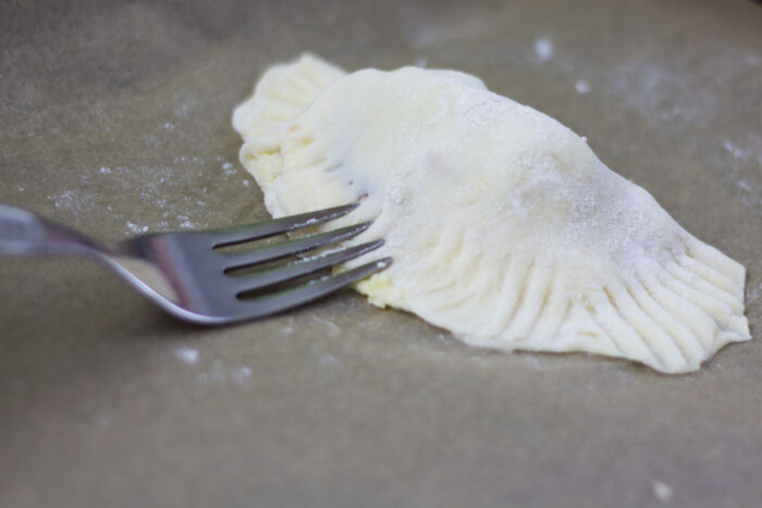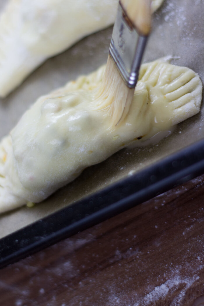 Ofen auf 200 Grad Ober- Unterhitze vorheizen und die Teigtaschen für 20 Minuten in den Ofen schieben, bis sie goldbraun sind.
