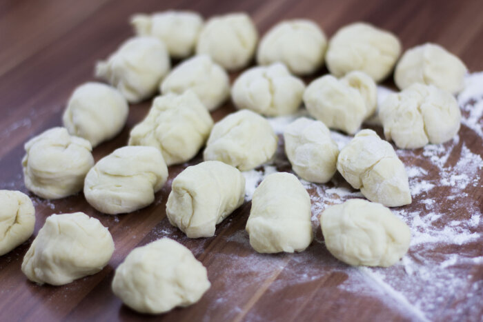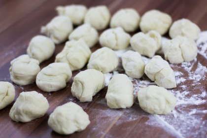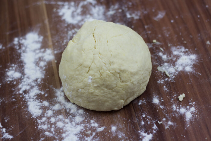 Falls der Teig zu klebrig ist und sich schlecht bearbeiten lässt, weiteres Mehl hinzugeben.