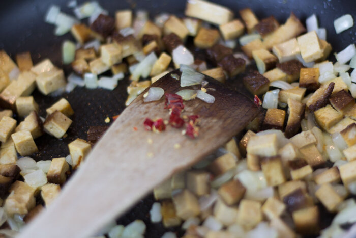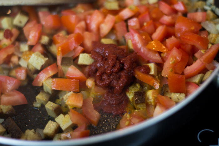Etwas Öl in eine Pfanne geben. Zwiebeln darin anbraten bis sie glasig sind. Tofu zugeben und gut durchbraten. Chili und Tomaten zufügen und 2 Minuten mit braten lassen. Tomatenmark unterrühren und mit Salz und Pfeffer abschmecken.