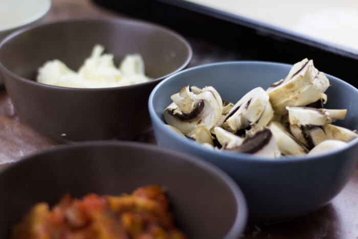 Champignons putzen und klein schneiden. Mozzarella ebenfalls in kleine Stücke zerteilen. Champignons, Mozzarella, Saucen-Füllung und Gouda je in eine Schüssel geben.