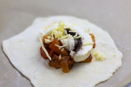 Ausgetrollten Teig nehmen und auf einem Esslöffel: Saucen-Füllung, Champignons, Mozzarella und Gouda geben. Ei in eine Schüssel aufschlagen, verquirlen und den Teigrand damit einpinseln. Den Teig zur Hälfte umschlagen, so dass die Füllung verschlossen ist. Mit einer Gabel die Enden der Teigtasche fest zusammendrücken und mit Ei bepinseln.