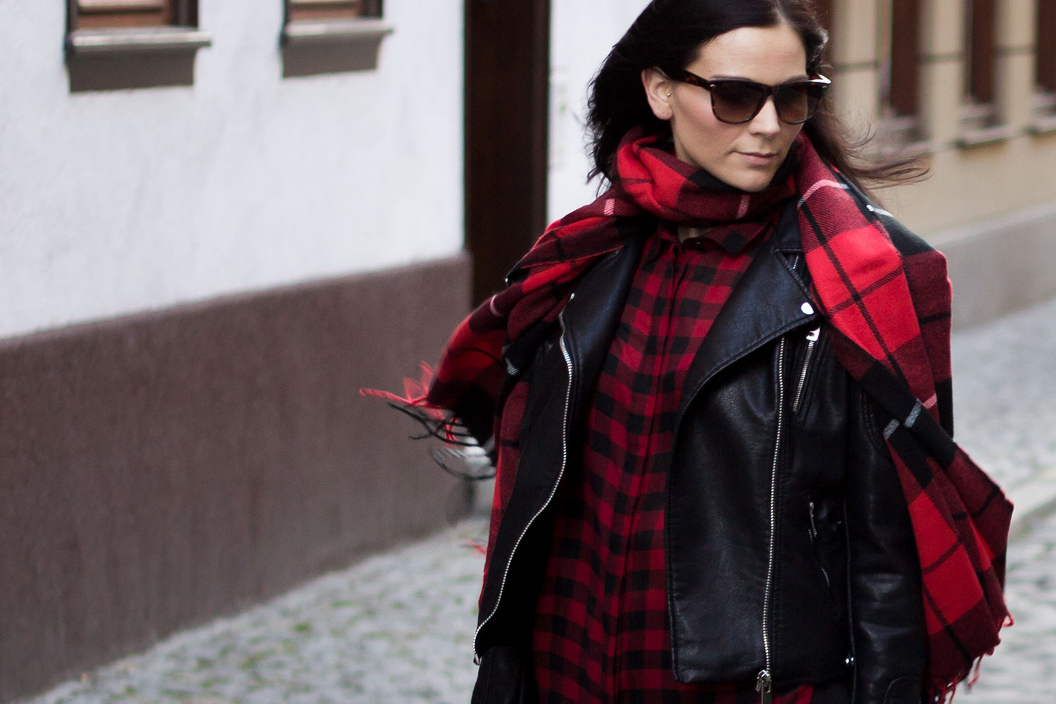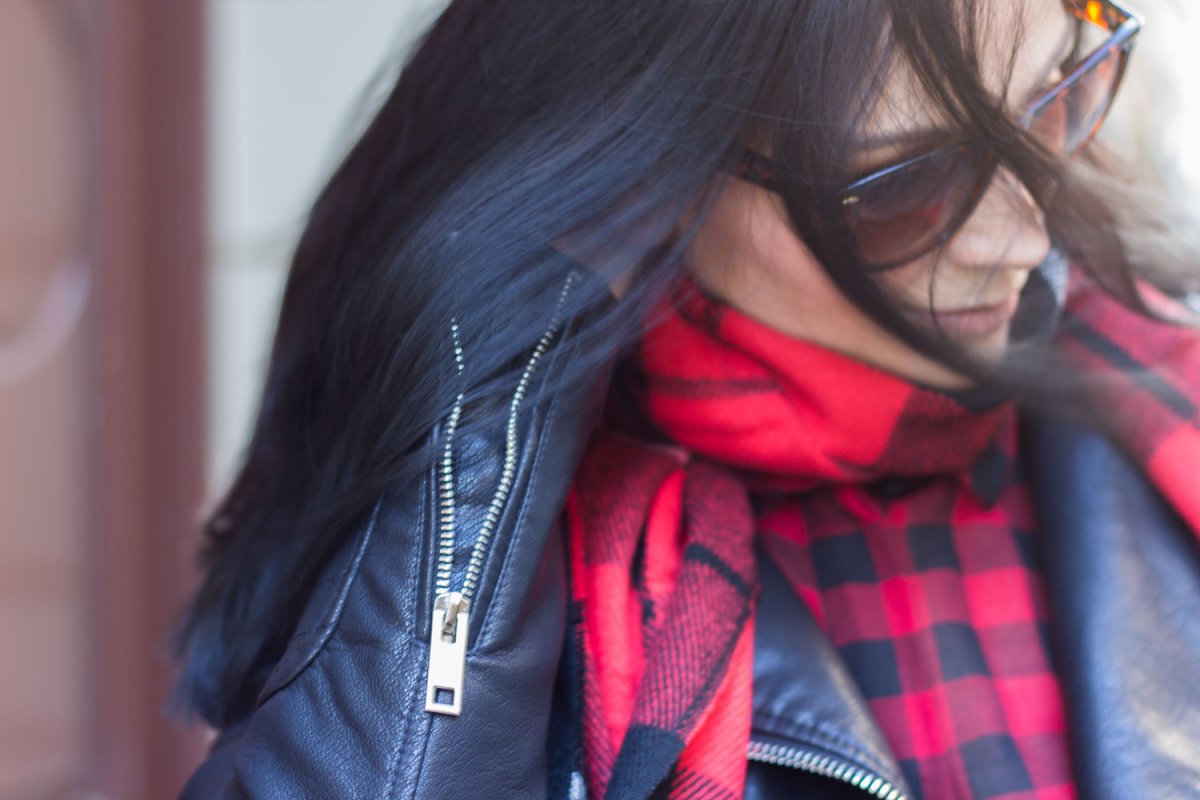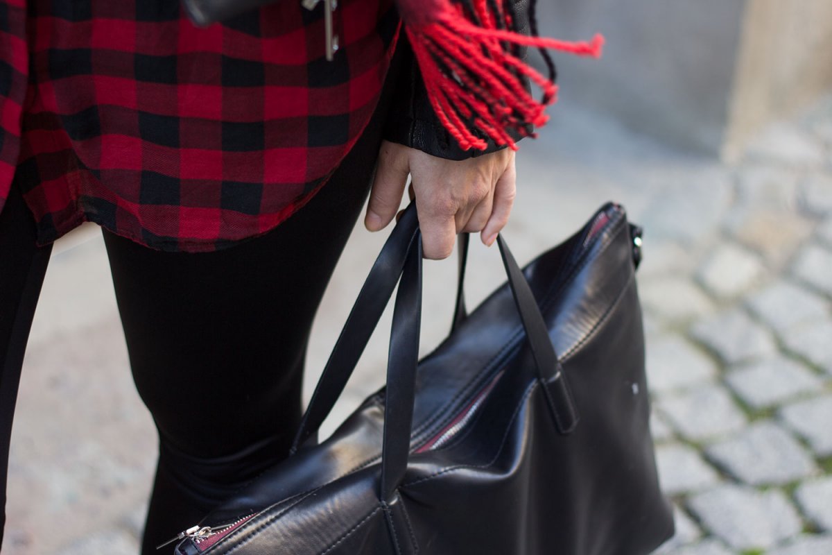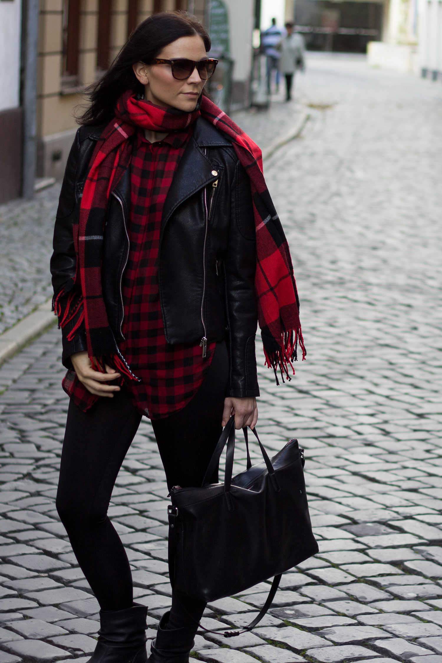 // Lederjacke – Zara // Karohemd – H&M // Leggings – H&M // Schuhe – Schuhtempel24 // Tasche – Zara (ähnliche hier) // Schal – Gina Tricot (ähnlicher hier und hier) // Sonnenbrille – Gina Tricot (ähnliche hier) //