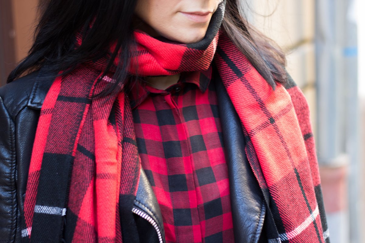 Das Symbol der Grunge-Bewegung ist das Karohemd, ich trage es kleinkariert in Rot und Schwarz. Als wäre das nicht schon „Grunge“ genug. Ich setze noch eins oben drauf und schwinge dem passenden Schal in Tartanoptik um den Hals. Denn doppelt hält bekanntlich besser!