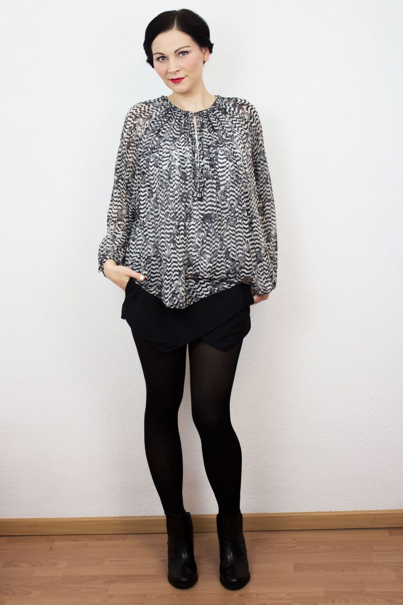 Eine Outfitkombination in Schwarz-Weiß ist ein Klassiker, der sich bestens für die Festtage eignet. Sehr frisch und elegant wirkt das Outfit mit einer Musterbluse, aber auch große geometrische Formen lassen den Schwarz-Weiß-Look äußerst interessant erscheinen.