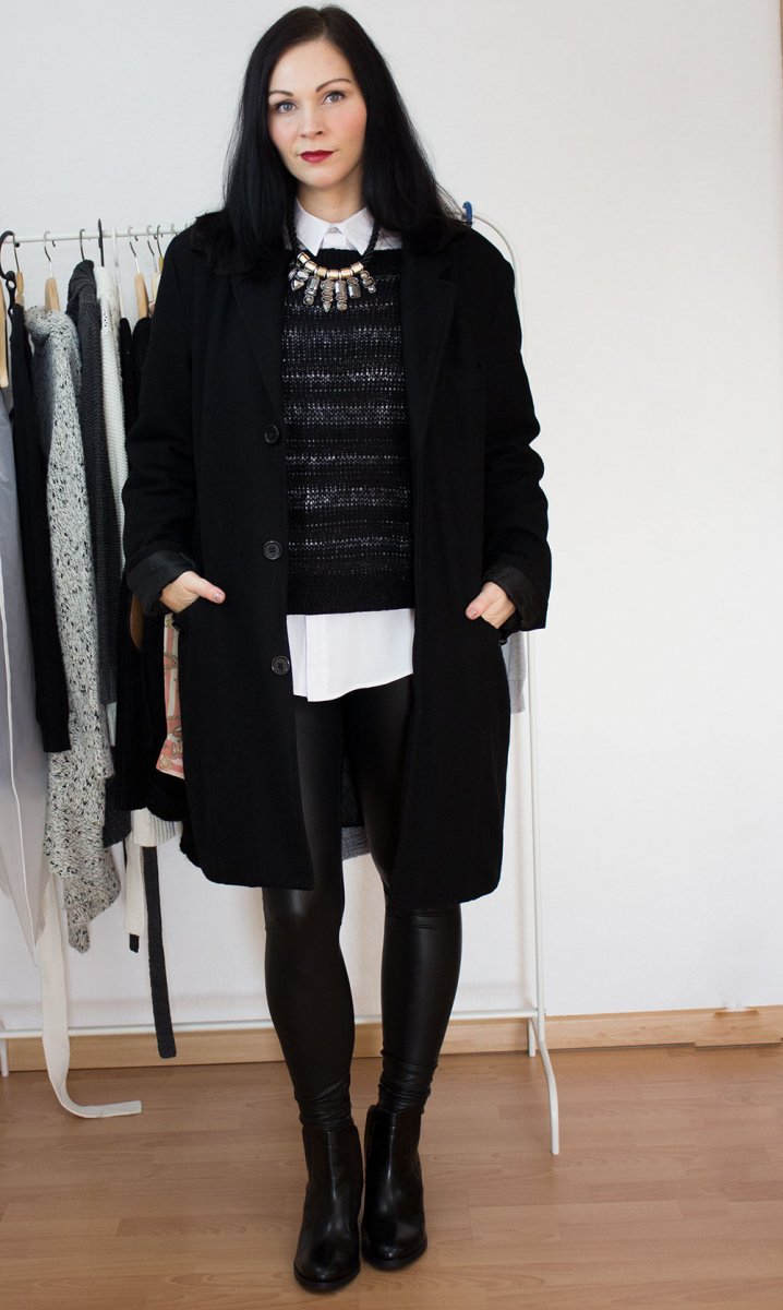 // Mantel – Freund // Pullover – Vero Moda // Hemd – H&M // Leggings – Pieces // Schuhe – H&M // Kette – Primark // Lippenstift – MAC Dubonnet //