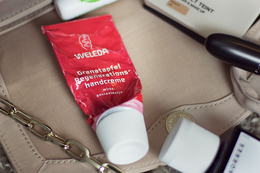 Meine Hände sind vor allem im Winter sehr trocken und feuchtigkeitsarm. Deshalb habe ich in meiner Tasche immer eine Handcreme griffbereit. Derzeit benutze ich die Weleda Handcreme „Granatapfel“. Sie macht meine Hände glatt und geschmeidig und verleiht ihnen einen sinnlichen Winterduft aus Sandelholz und Davana.