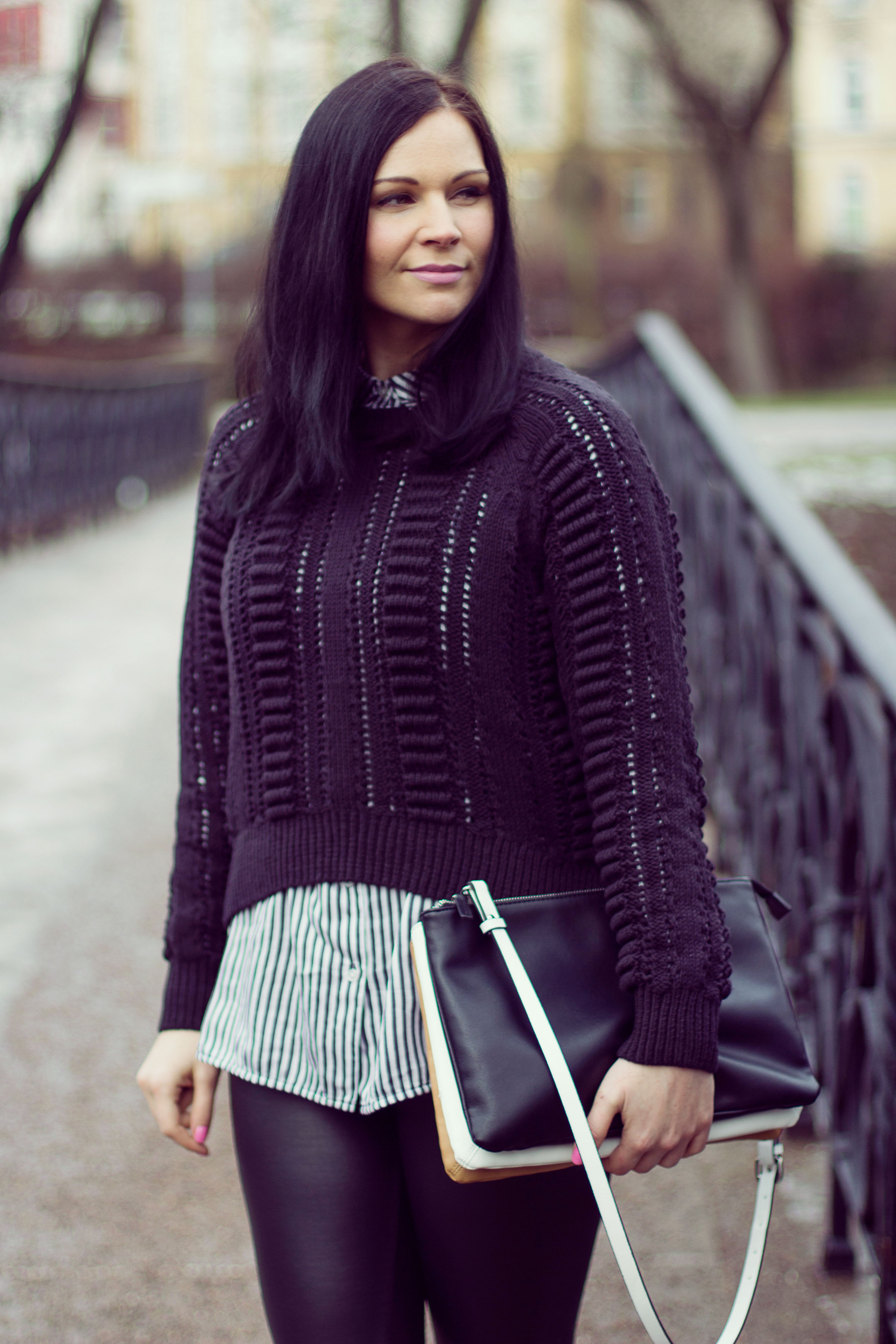 Zu warm für einen Wollmantel und zu kalt für einen Blazer, entschloss ich mich für das Zwischenstück als netten Begleiter – den Kurzmantel. Diesen kombiniere ich mit einer gestreiften Bluse und einem schwarzen Pullover. Einem „Cropped Sweater“ mit interessantem Lochstickmuster der die schwarz-weißen Streifen der Bluse durchscheinen lässt. Blusen-Pullover-Kombinationen gehören für mich einfach zum Winter und sind zu jedem Anlass tragbar. Diese Saison haben es mir vor allem die Kurz-Pullover sehr angetan.