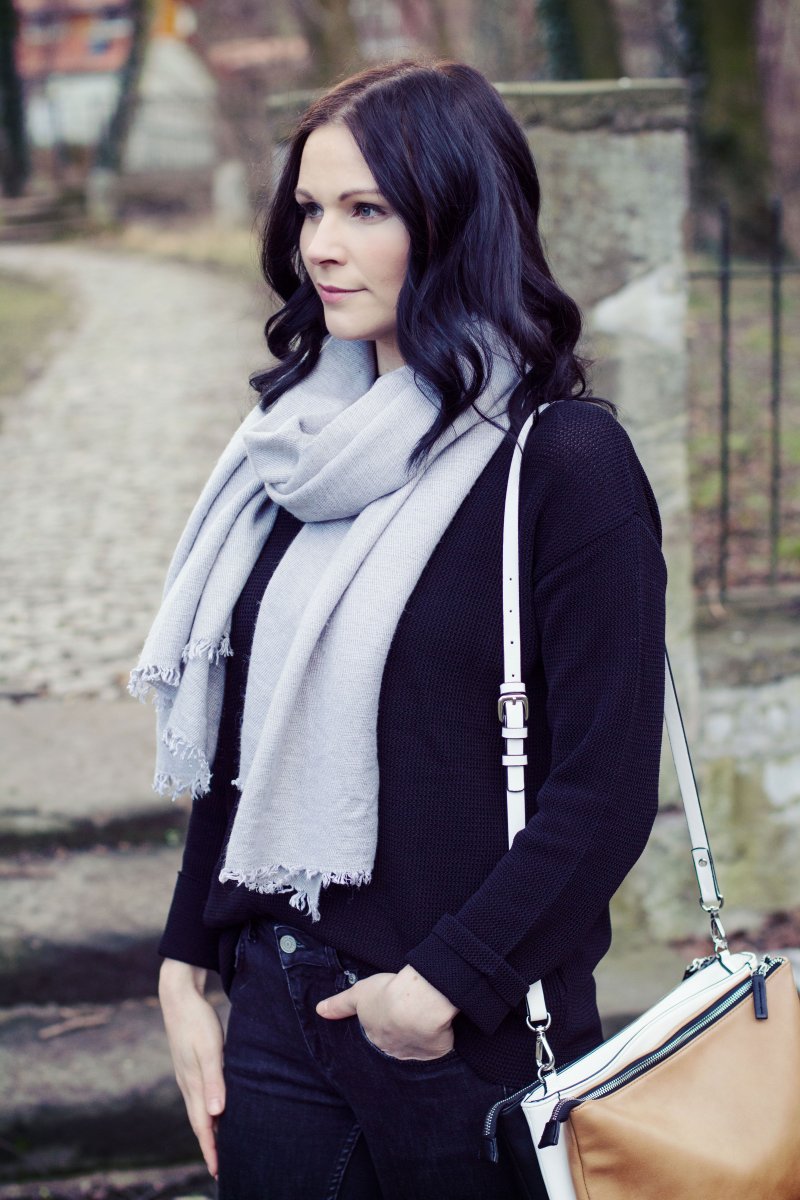 Am liebsten trage ich den All-in-Black-Look mit unterschiedlichen Materialien. Der schwarze Strukturpullover bildet die Basis für meinen Style und wird ergänzt durch die derben schwarzen Jeans, die zu meinen Basics zählt. Aber auch die kleinen Highlights machen dieses Outfit zu etwas ganz Besonderem.
