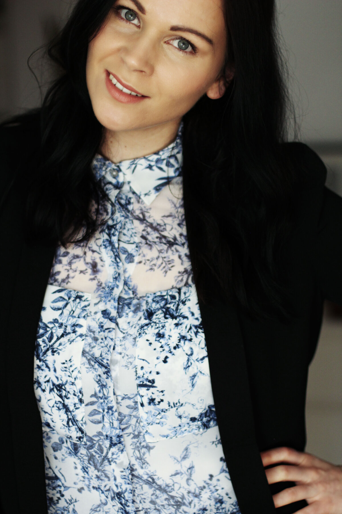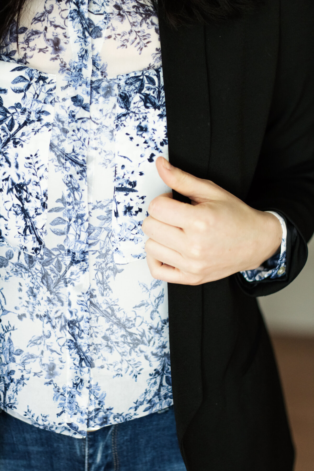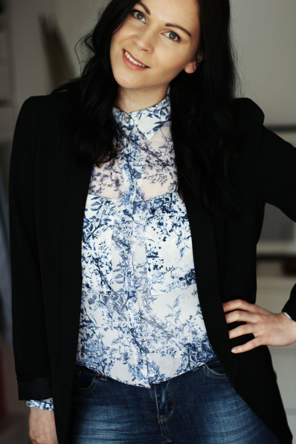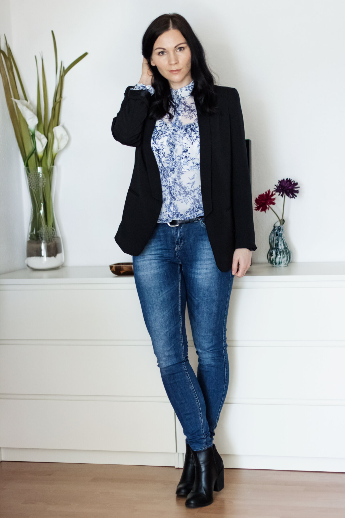 Das zweite Outfit eignet sich perfekt für den Büro-Alltag. Der klassische schwarze Blazer mit figurbetontem Schnitt passt sehr gut zu diesem Look, außerdem lässt er sich vielseitig kombinieren und gehört zu meinen Basics. Dazu trage ich eine Bluse mit auffälligem Blumenmuster in Blau und Weiß. Ich weiß noch wie ich dieser Bluse vor einem Jahr hinter her gejagt bin und gerade noch das letzte Exemplar im Store ergattert habe. Die große Liebe zu dieser Bluse hält weiter an, denn ich trage sie immer noch sehr gerne. Zu Bluse und Blazer kombiniere ich eine blaue Skinny Jeans und schwarze Ankle Boots, die ich euch schon sehr oft gezeigt habe.