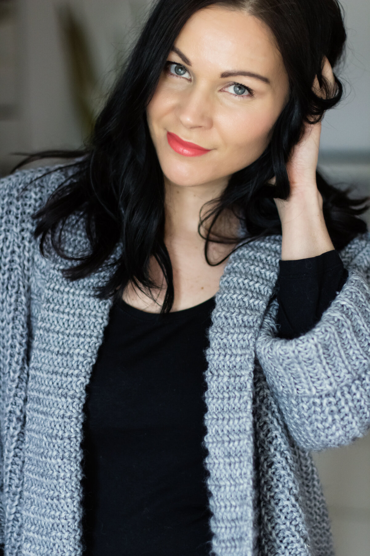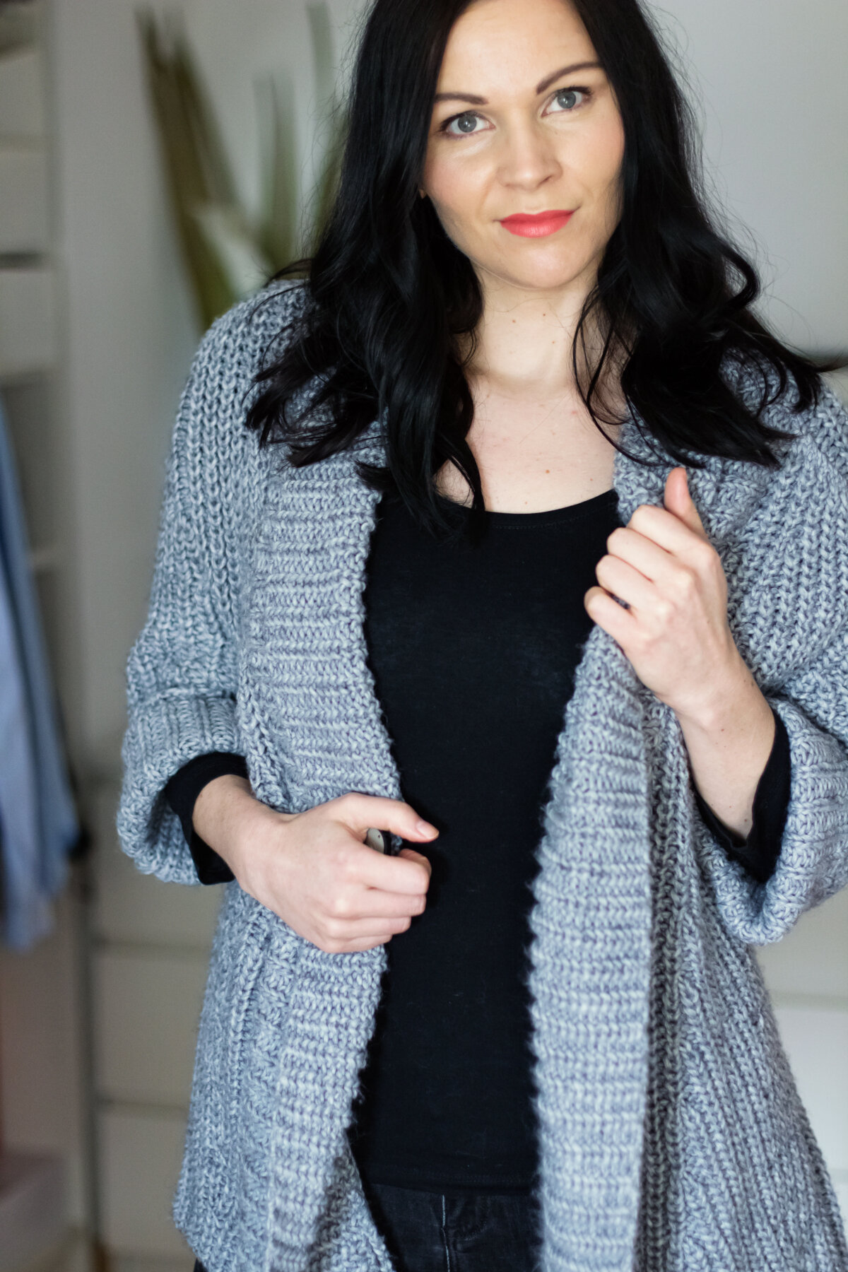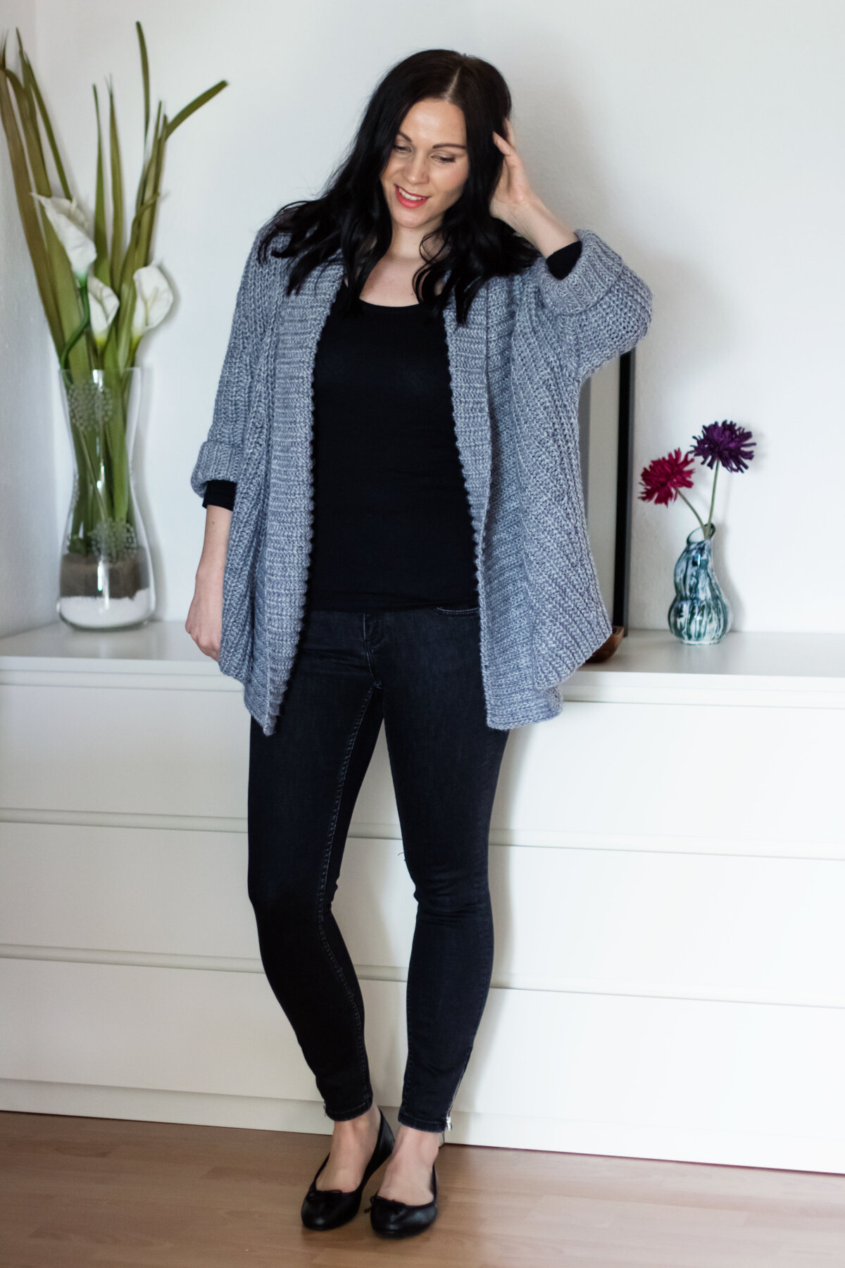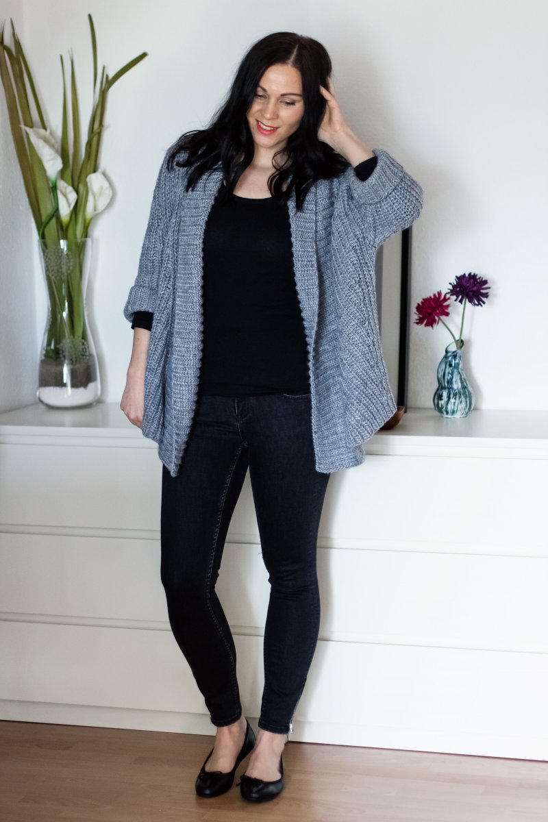 Das dritte Outfit ist sehr gemütlich, was nicht zuletzt an dem übergroßen Wollcardigan liegt. Ich liebe diese Strickjacke, denn sie ist sehr bequem, warm und kratzt überhaupt nicht. Sie ist vielseitig tragbar und macht auch zur Bluse eine gute Figur. Zu dem Cardigan trage ich ein figurbetontes schwarzes Basic-Top und ebenfalls schwarze Skinny Jeans. An den Füßen geht es klassisch zu, denn ich trage wieder meine schwarzen Leder-Ballerinas.