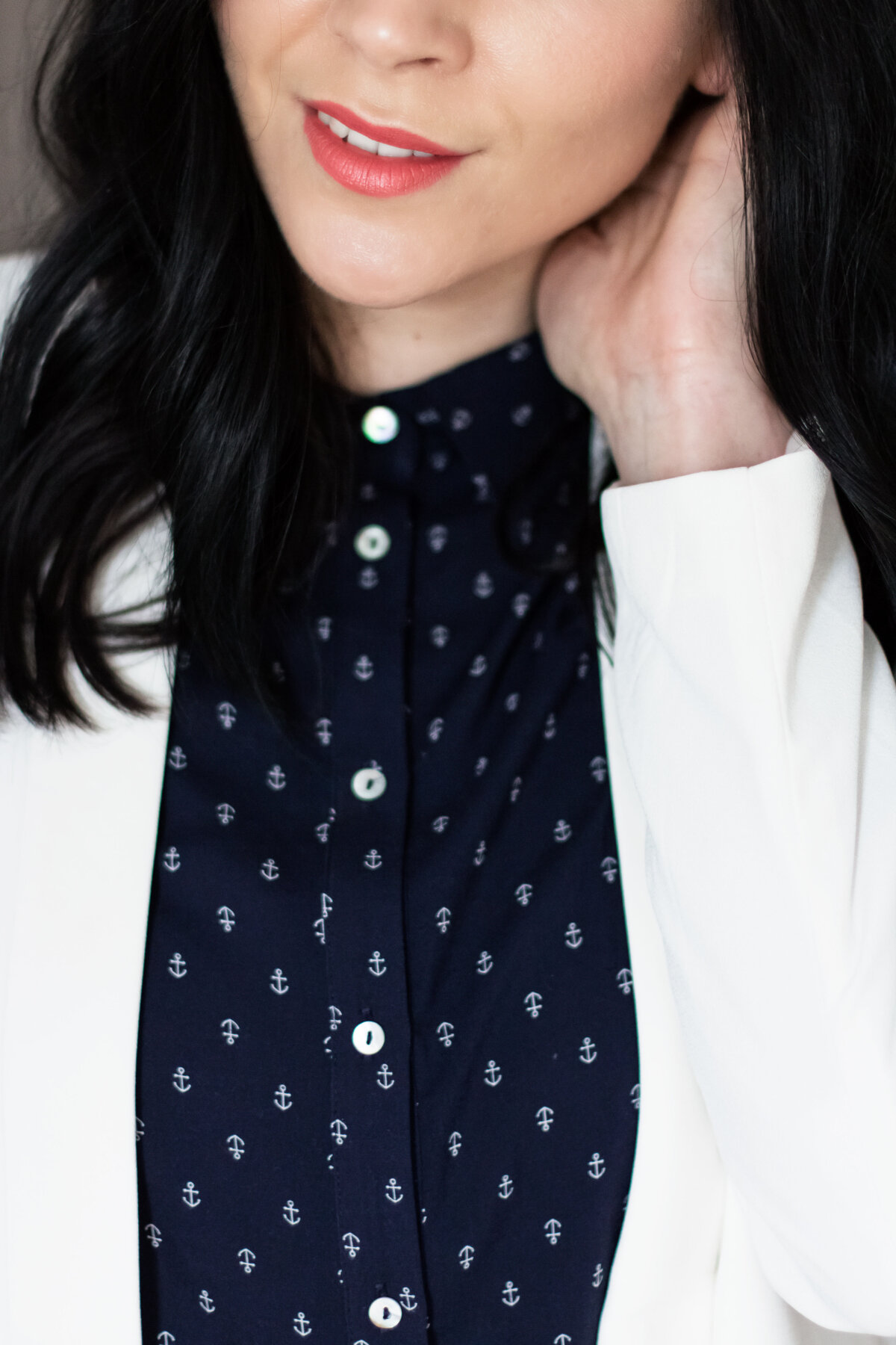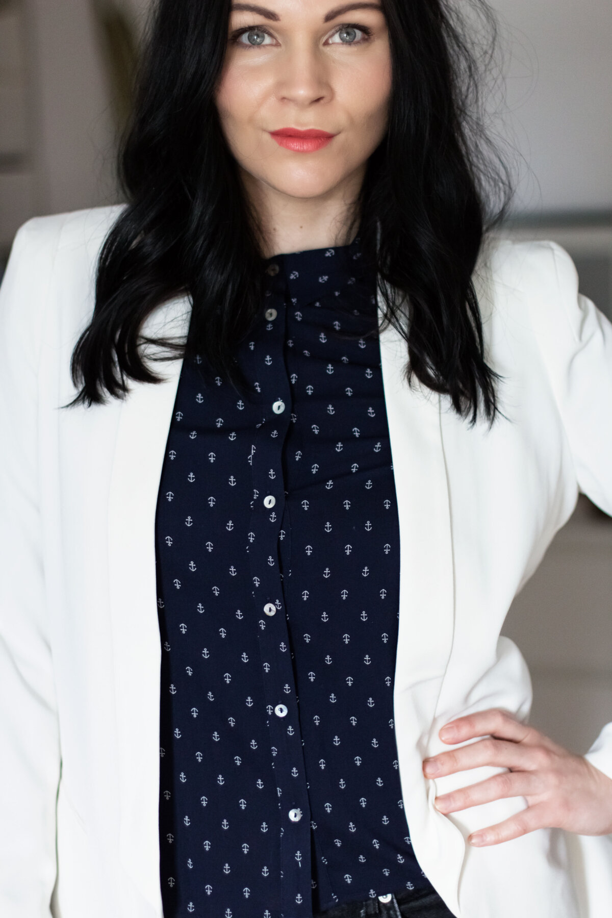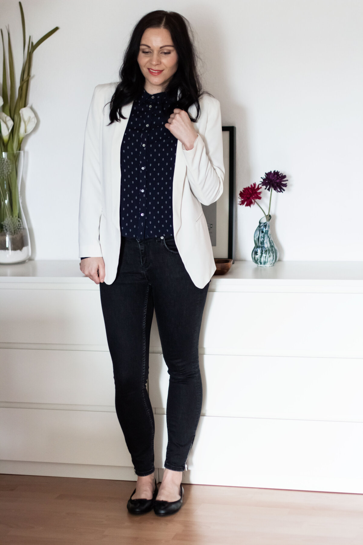 Ganz klassisch ist mein erste Outfitkombination, die aus Bluse, Jeans und Blazer besteht. Das Augenmerk bei diesem Look liegt auf dem auffälligen weißen Blazer, den ich vor allem im Frühling und Sommer sehr gerne trage. Dazu kombiniere ich eine dunkelblaue Bluse mit dezentem Anker Muster. Die Bluse ist mein Favorit an diesem Outfit. Ich könnte sie momentan rund um die Uhr tragen. Dazu trage ich schwarze Jeans und Leder-Ballerinas.
