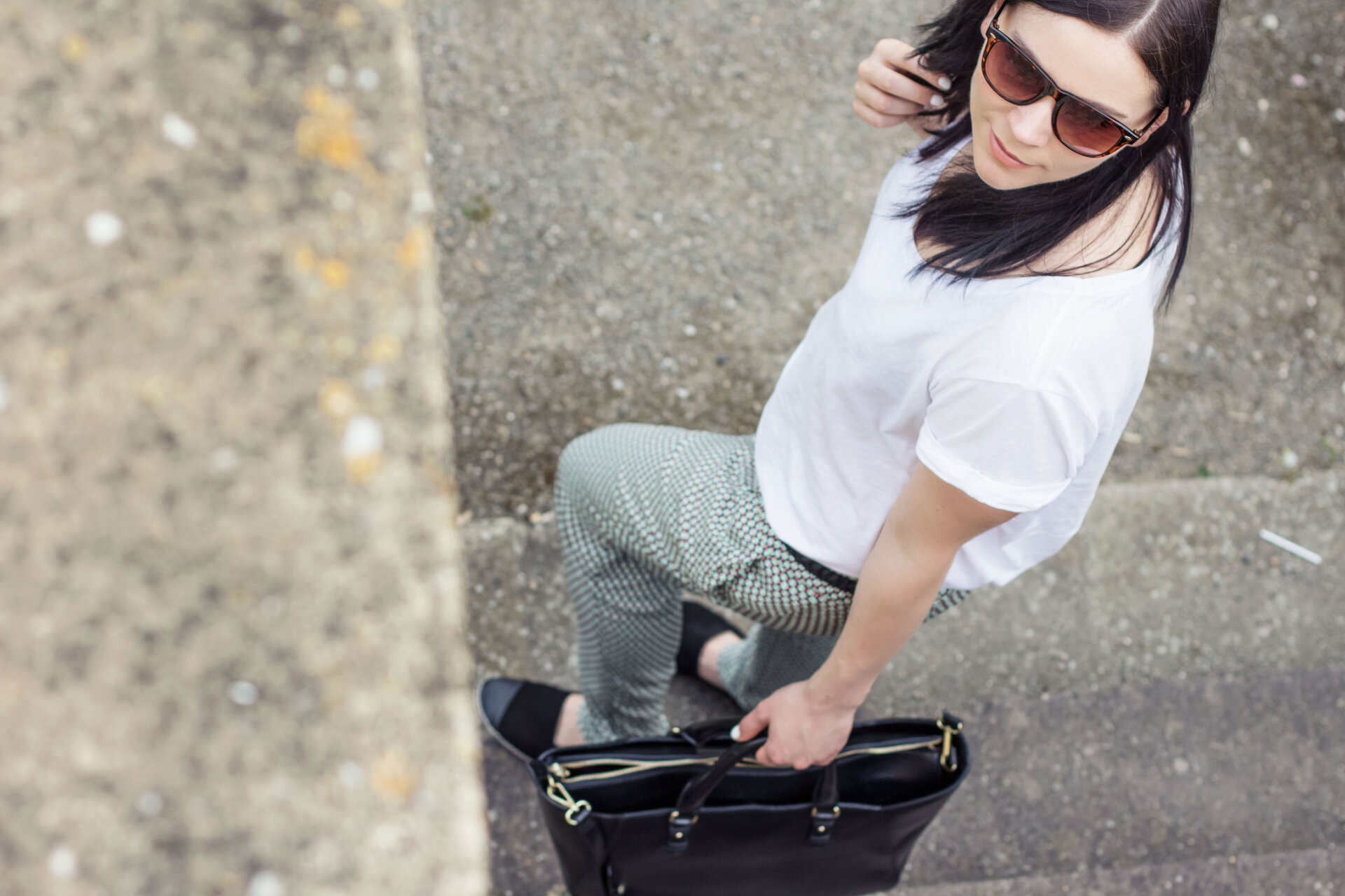 // Shirt – H&M // Hose – Zara // Schuhe – Topshop // Tasche – Zara // Sonnenbrille – Ginatricot // Nagellack Essie – Blanc // Lippenstift MAC – Freckletone //