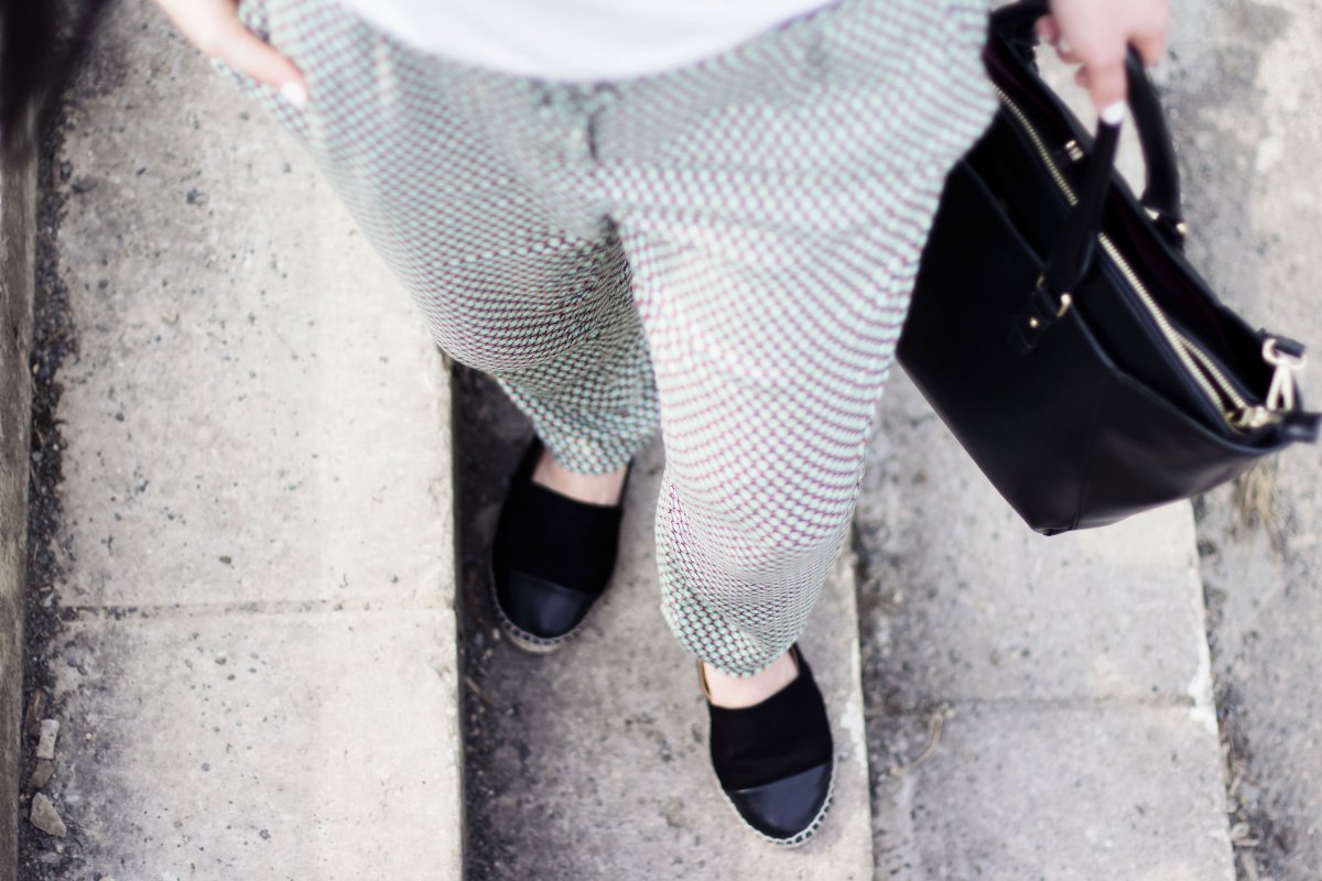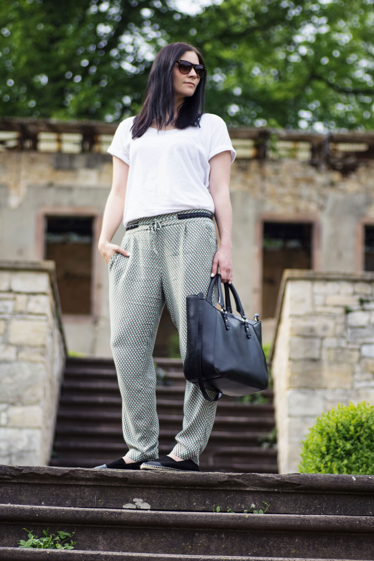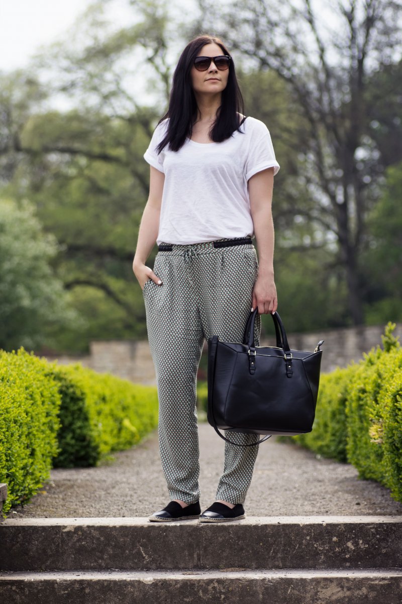 Die Musterhose gehört für mich zum Frühling/Sommer. Sie vereint zwei mir wichtige Eigenschaften: bequem und chic. Sie sitzt luftig auf der Haut und ist bei 20 Grad und Sonnenschein mein Favorit. Am liebsten kombiniere ich sie mit Basics. Einem weißen Shirt und flachen Espadrilles – wie heute. Der Look ist sehr bequem und alltagstauglich. Ein gemütliches Outfit für den Schul- oder Unitag.