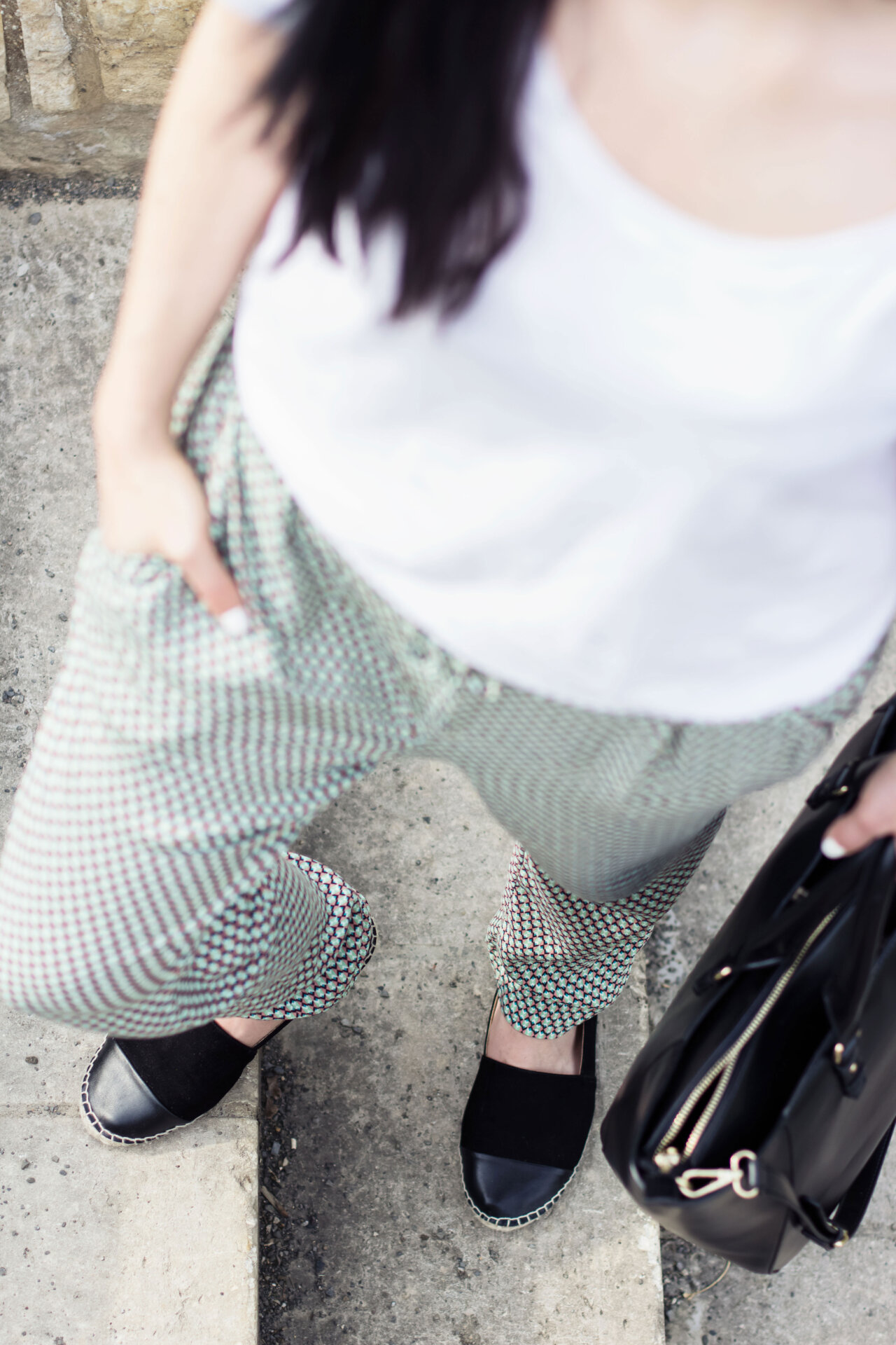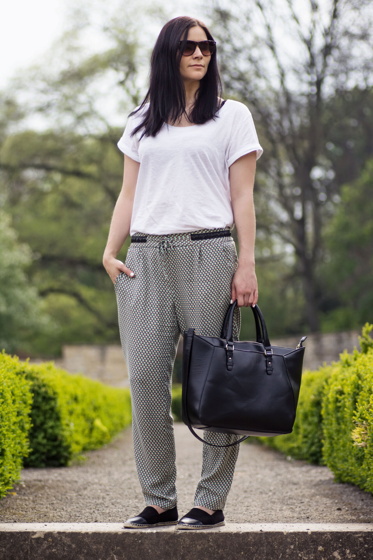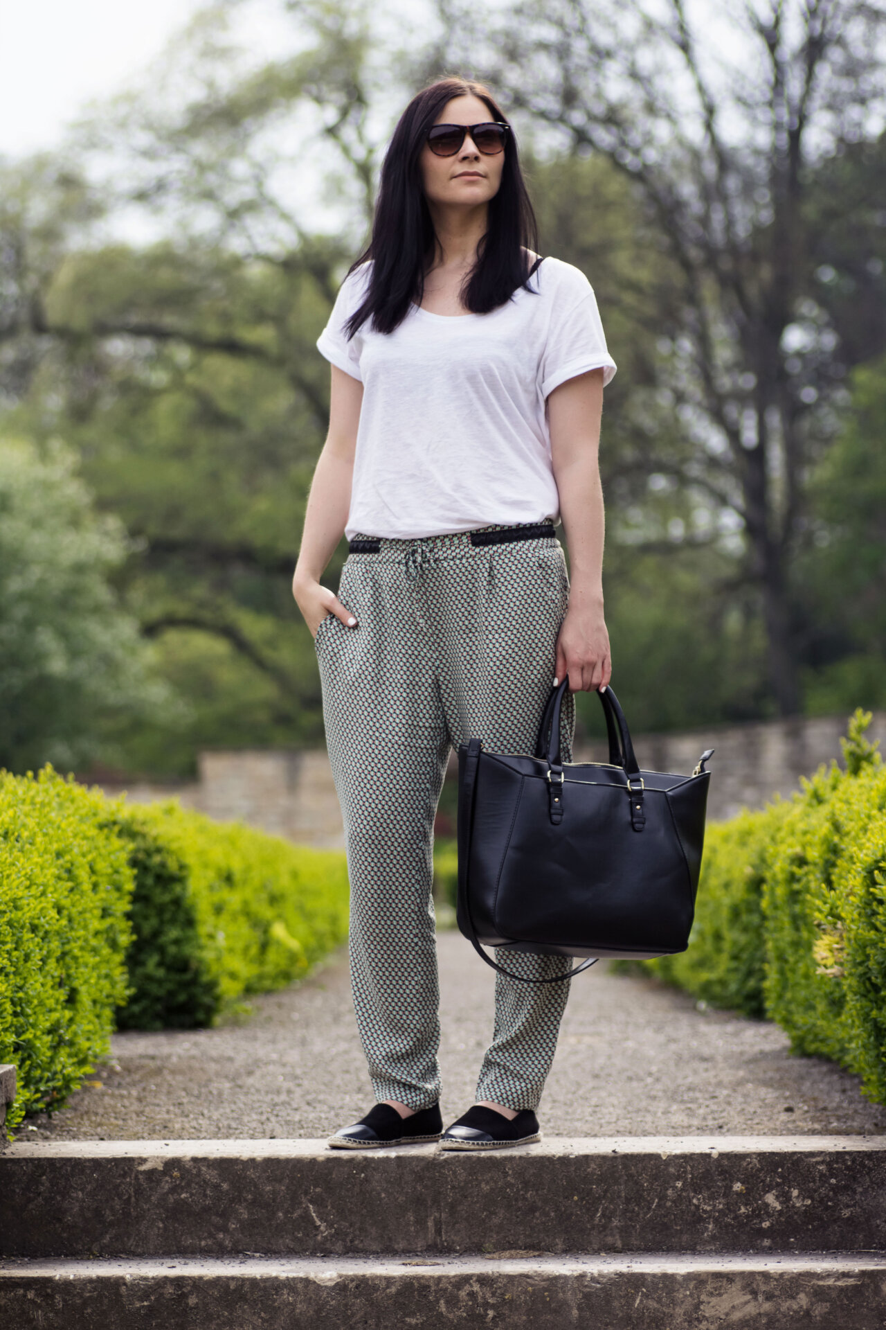 Die Musterhose gehört für mich zum Frühling/Sommer. Sie vereint zwei mir wichtige Eigenschaften: bequem und chic. Sie sitzt luftig auf der Haut und ist bei 20 Grad und Sonnenschein mein Favorit. Am liebsten kombiniere ich sie mit Basics. Einem weißen Shirt und flachen Espadrilles – wie heute. Der Look ist sehr bequem und alltagstauglich. Ein gemütliches Outfit für den Schul- oder Unitag.