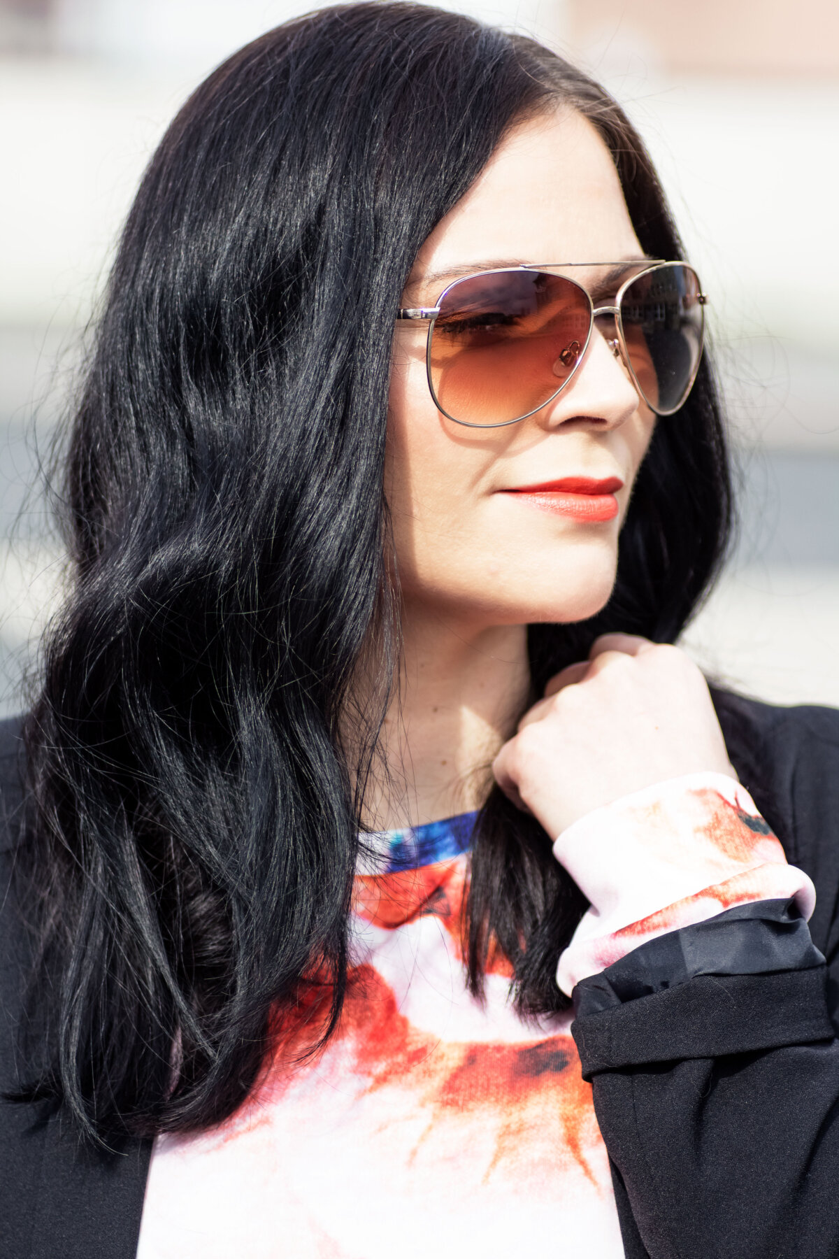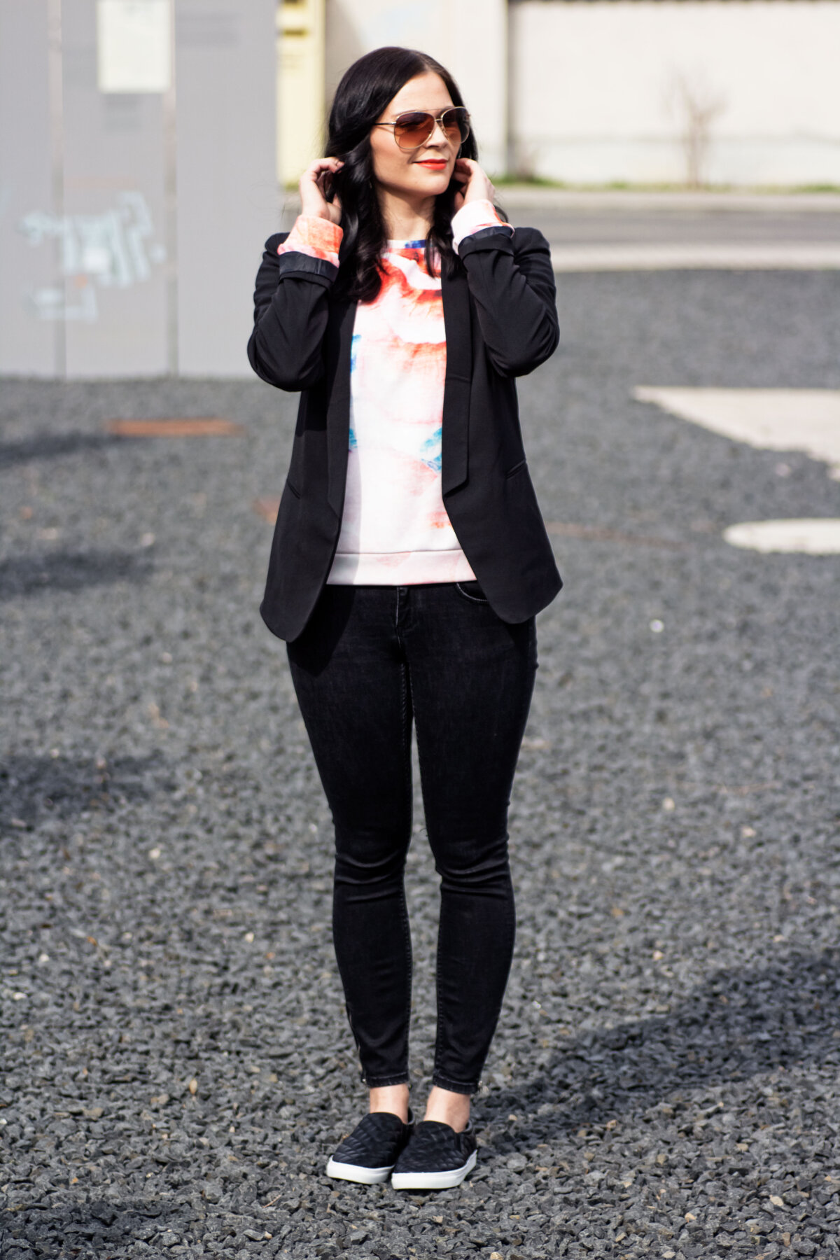 // Blazer – H&M // Sweatshirt – Zara // Jeans – Ginatricot // Schuhe – H&M // Sonnenbrille – Ginatricot // Lippenstift MAC – Morange //