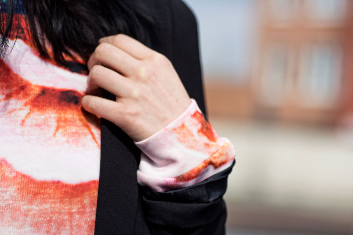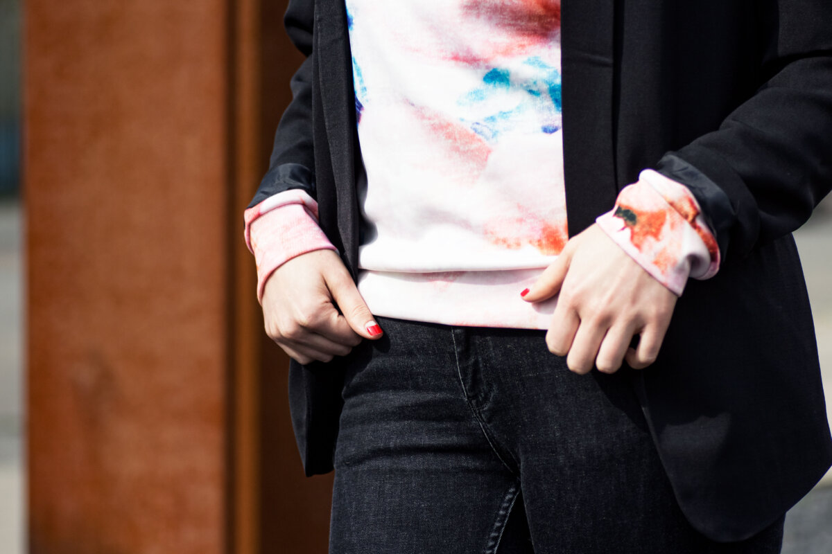 Ein wenig Farbe sollte es im Frühling dann doch sein. Deshalb stülpte ich mir meinen bunten Neopren Pullover von Zara über den Kopf. Der Pulli ist übrigens aktuell und gefällt mir sehr gut. Vor allem das abstrakte Blüten-Print. Aber auch das ungewohnte Material veranlasst mich regelmäßig nach ihm zu greifen.