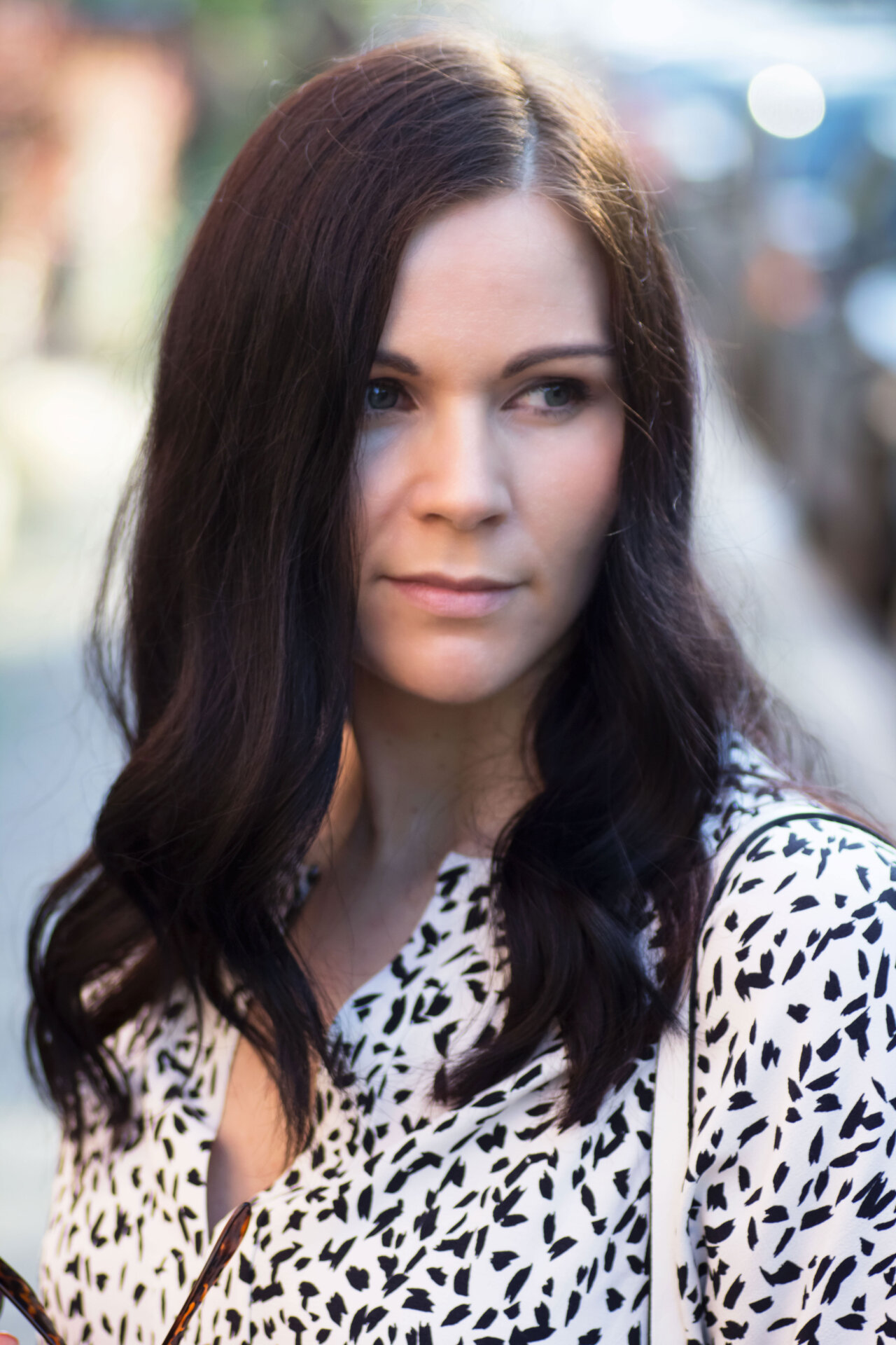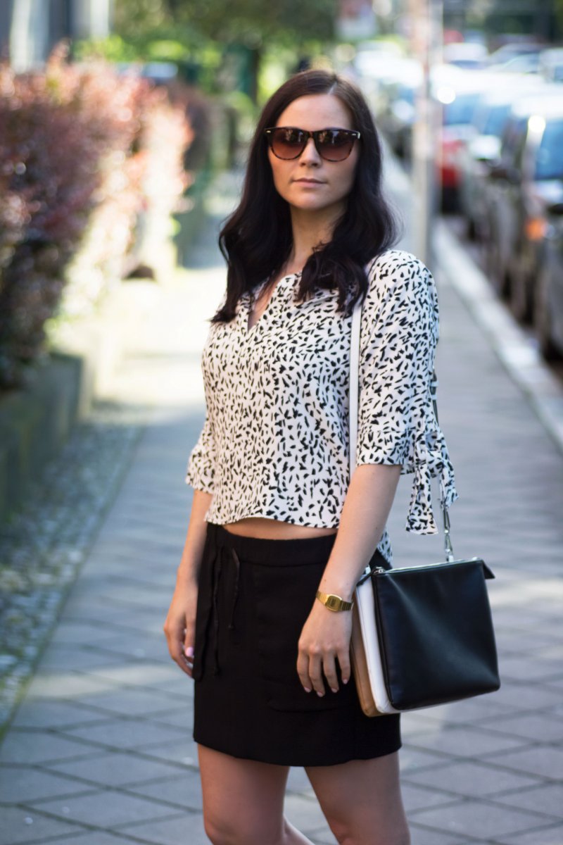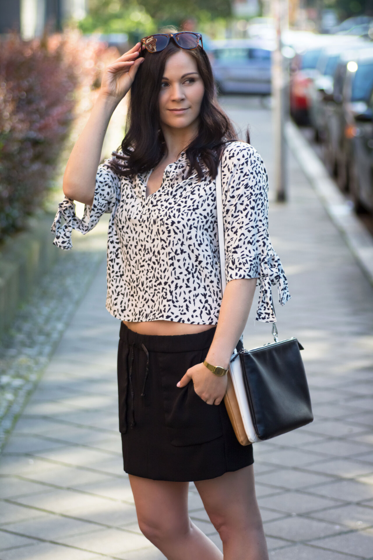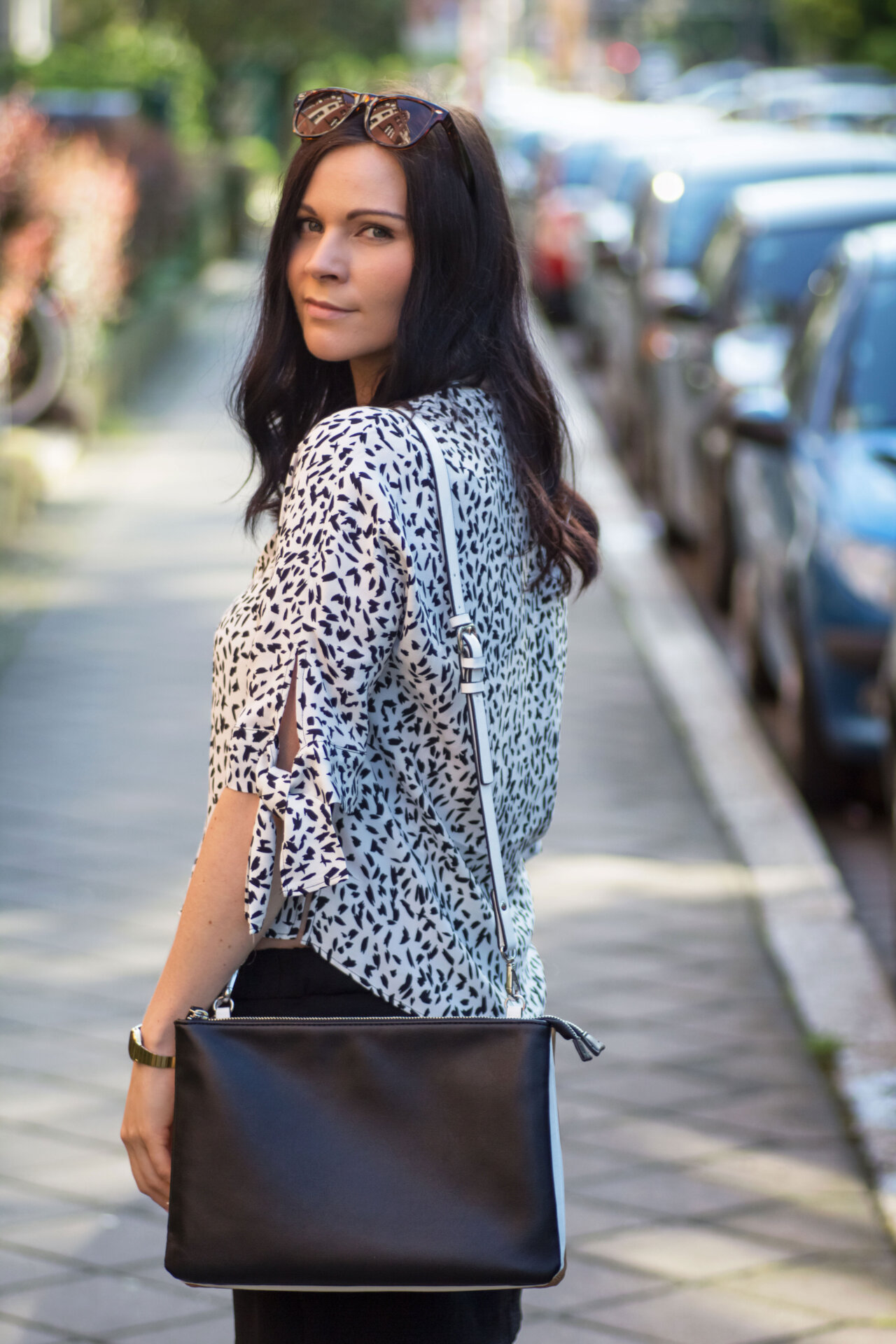 Zum schwarzen Rock kombiniere ich meine neue Print-Bluse von Zara. Bei dem tollen abstrakten Muster konnte ich einfach nicht nein sagen, obwohl die Bluse mit 50 € relativ teuer ist. Aber Frau gönnt sich ja sonst nichts 😉 und deshalb musste sie mit. Vor allem die kleinen Details machen die Bluse für mich zum Hingucker. Besonders die geknoteten Ärmel wirken sehr elegant, aber ich mag auch den luftigen Schnitt der Bluse.