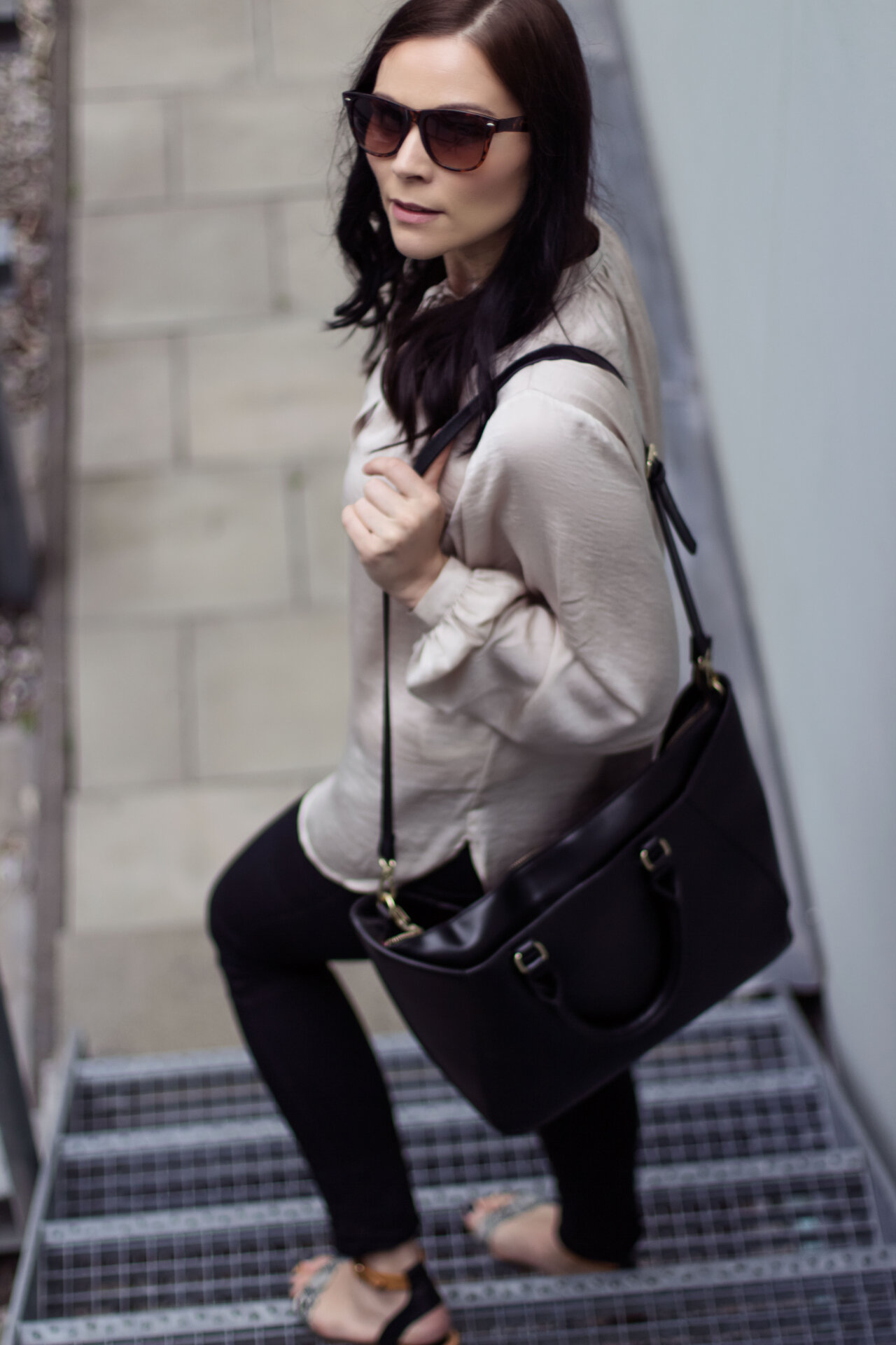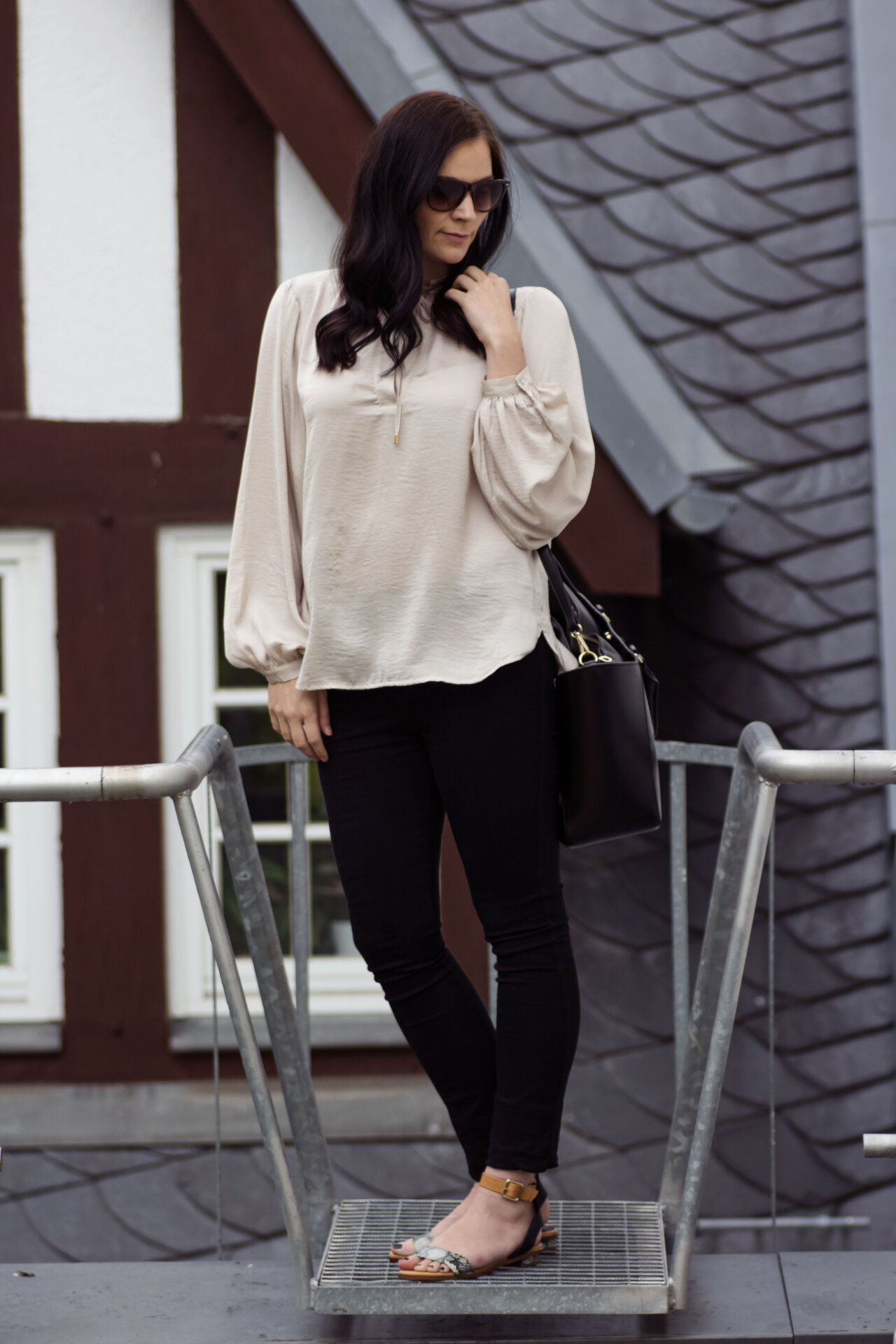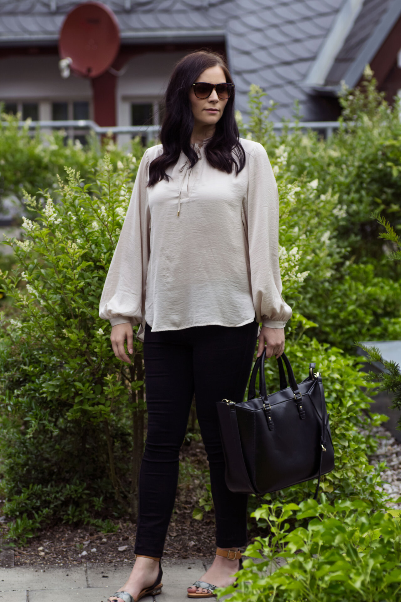 // Satin Bluse – H&M // Jeans – Urban Outfitters // Sandalen – H&M // Sonnenbrille – Gina Tricot // Tasche – Zara //
