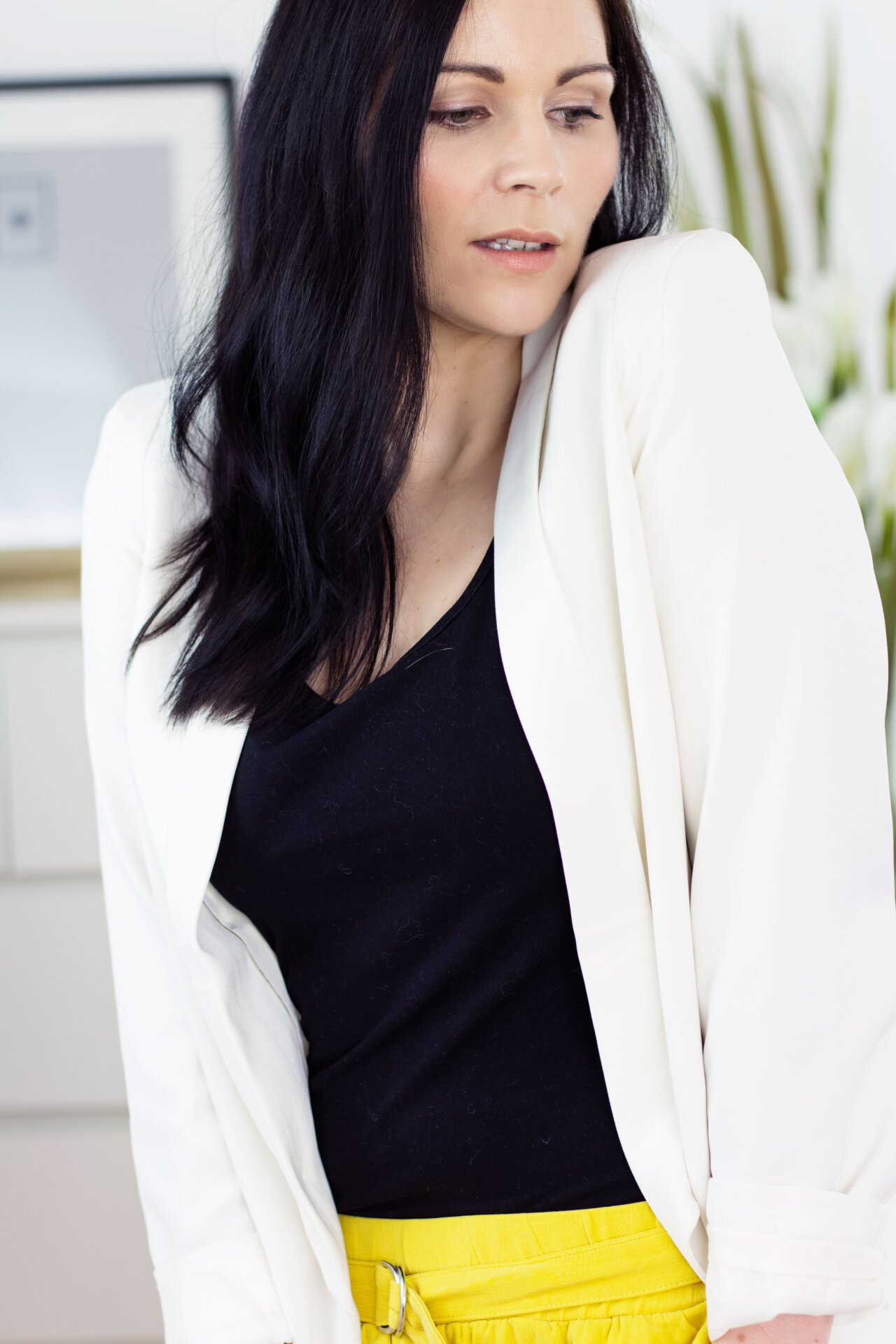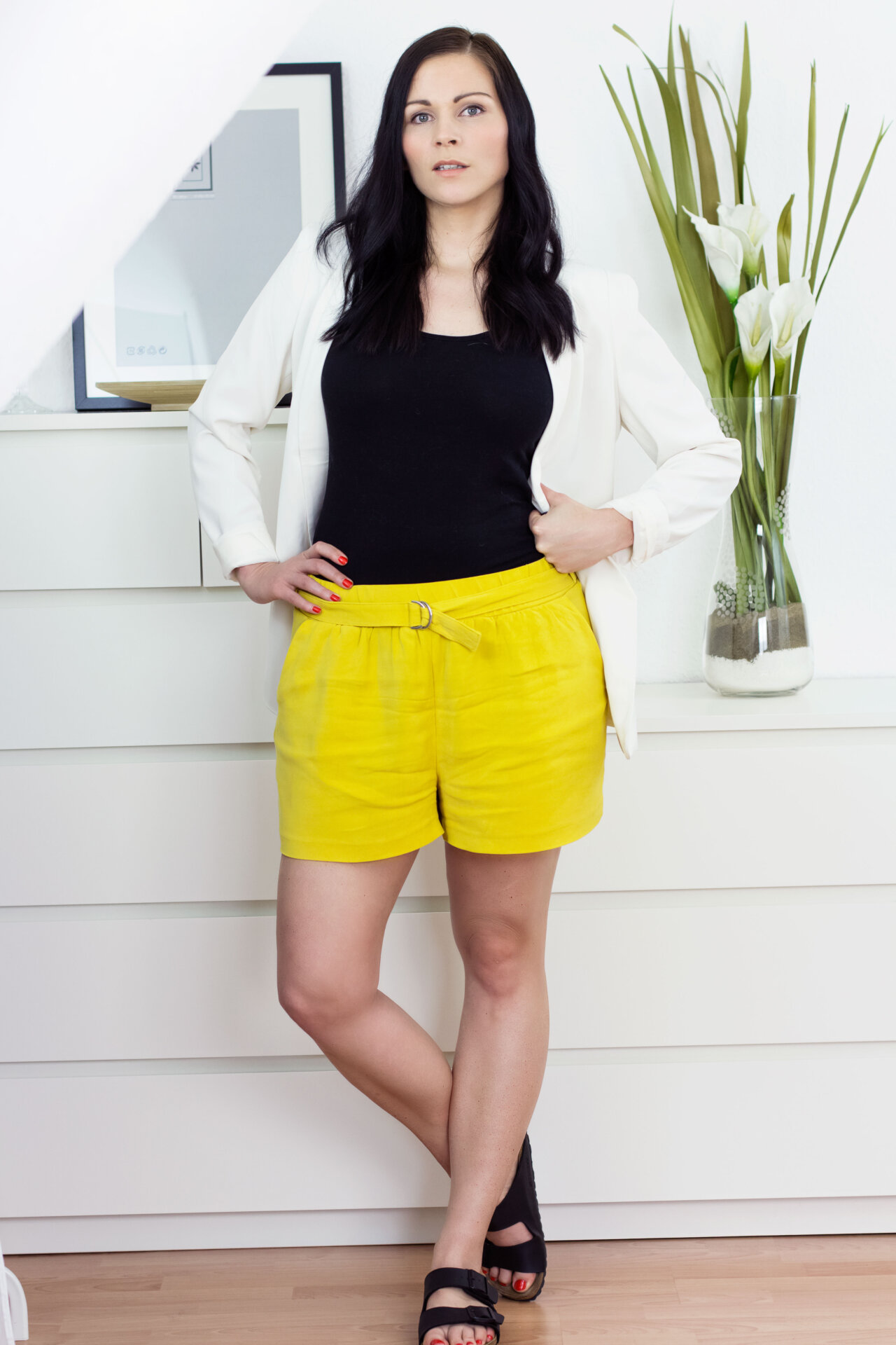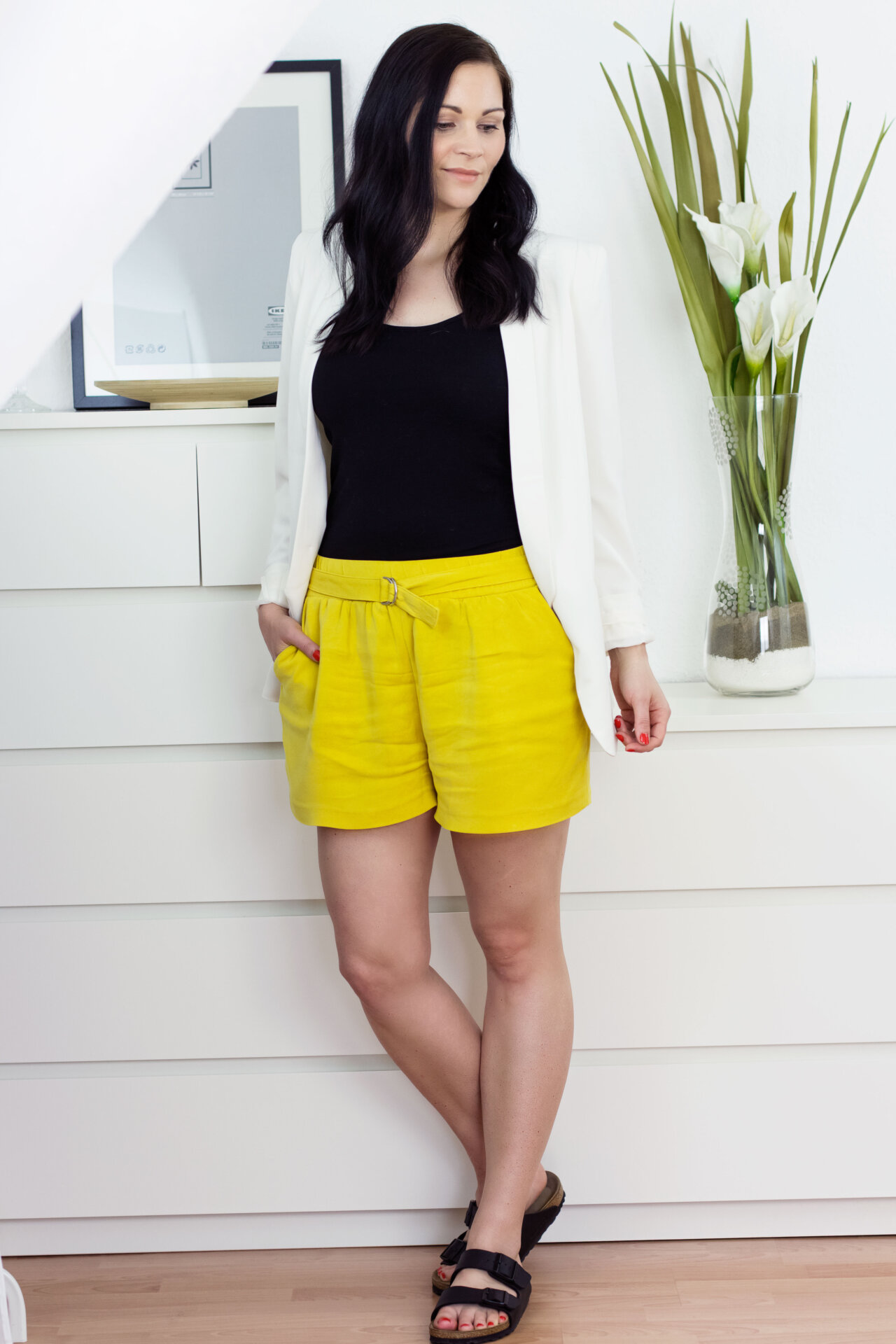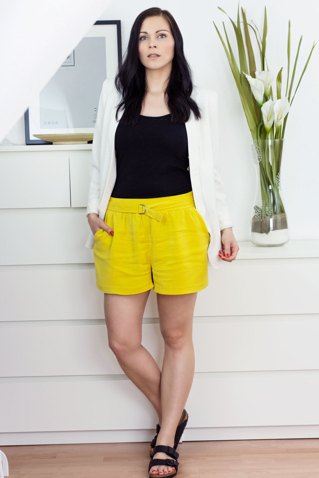 Outfit: gelbe Bermuda-Hose & weißer Blazer