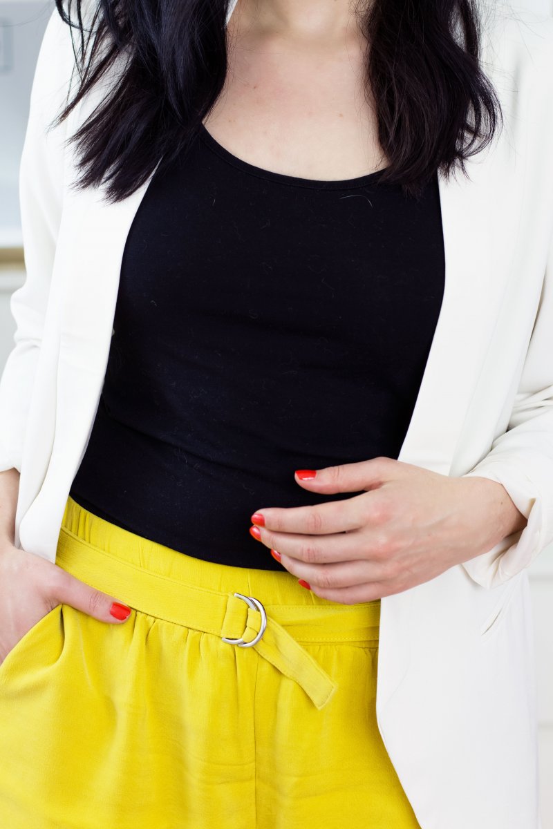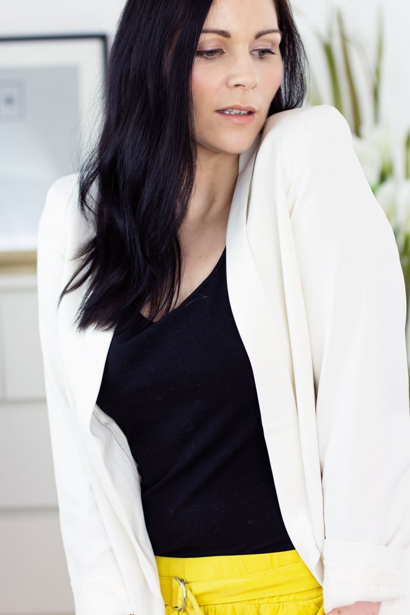 Meine gelbe Bermudas kombiniere ich mit einem schwarzen Basic-Top von H&M. Das eng anliegende Top passt sehr gut zum weiten Schnitt der Hose, aber auch ein weites Crop Top kann ich mir sehr gut zu der Bermuda-Hose vorstellen. Über den Top trage ich meinen geliebten weißen H&M Blazer. Ich trage im Sommer super gerne weiße Blazer. Ich finde der Blazer peppt jedes Outfit auf. Und so wirkt auch dieser sportliche Look durch den weißen Blazer sehr elegant. An den Füßen trage ich wie so oft in letzter Zeit meine schwarzen Birkenstock Sandalen. Das Modell heißt „Arizona“ und ist mein perfekter Alltagsbegleiter. Nicht zu Letzt wegen des bequemen Fußbettes läuft man wie auf Wolken.