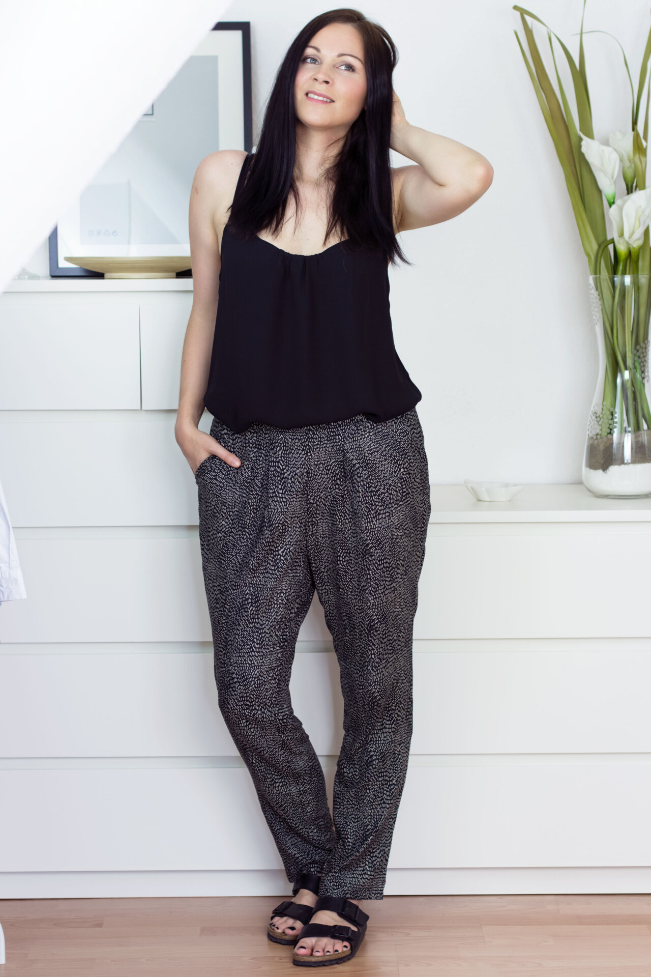 Aber zurück zum Outfit. Ich finde Muster werten jedes Outfit optisch auf und machen es interessant. Obwohl der Look so einfach ist, ist er nicht langweilig. Zum Musterhose kombiniere ich ein schwarzes Top von H&M, es hat den selben Schnitt wie das weiße Top aus meinem letzten Outfit Post. An den Füßen trage ich wieder einmal meine schwarzen Bikenstock Sandalen. Ich liebe einfach dieses Modell und zwar so sehr, dass ich mir diese Woche ein zweites Paar bestellt habe. Diesmal das Modell Madrid in Weiß. Ich weiß, einige von euch werden jetzt mit den Kopf schütteln und sich fragen, was ich nur an diesen Gesundheitstretern finde! Ich finde die Sandalen einfach super bequem und mag das klassisch schlichte Design.