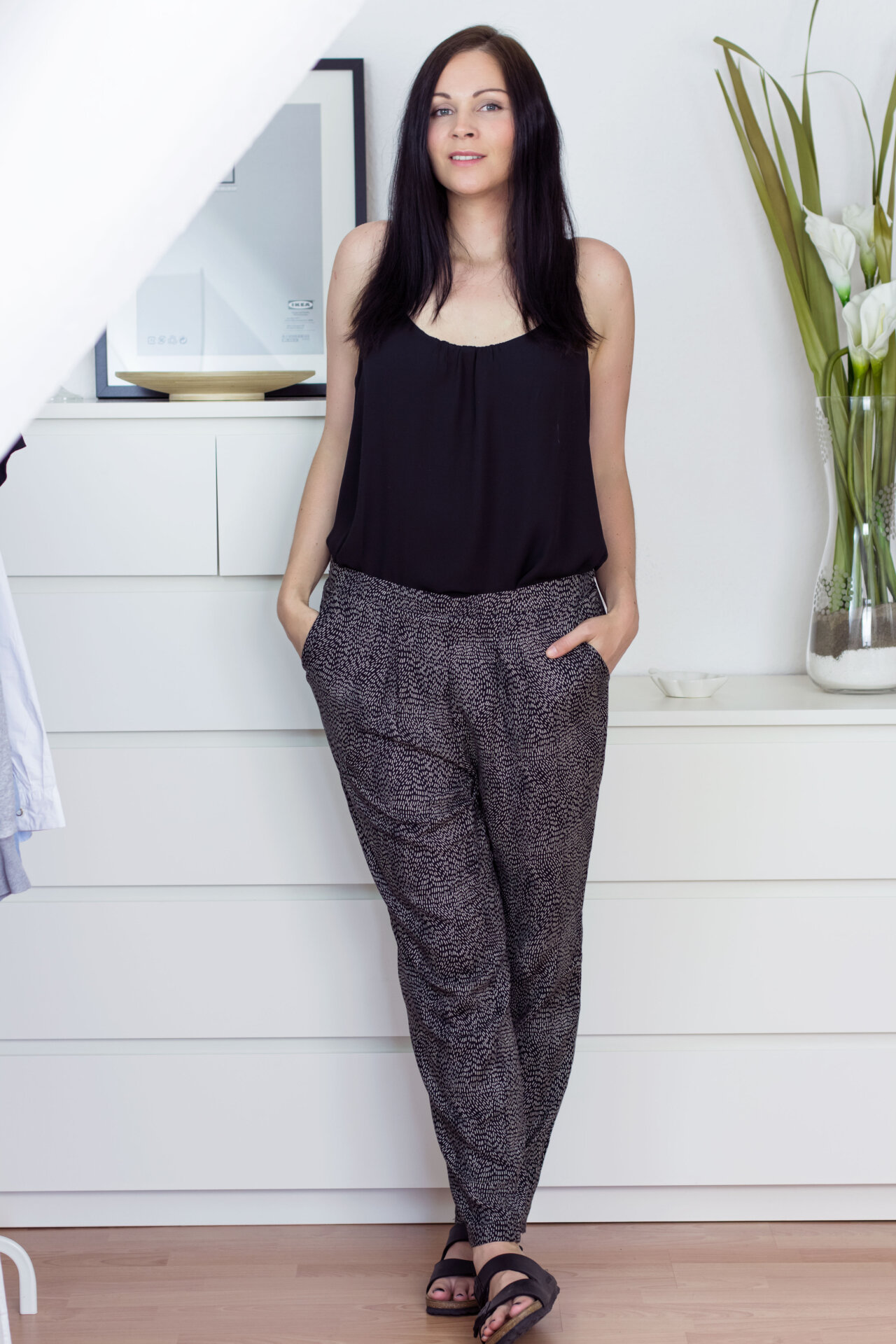 Outfit: gemusterte Hose, schwarzes H&M Top & schwarze Bikenstock Sandalen