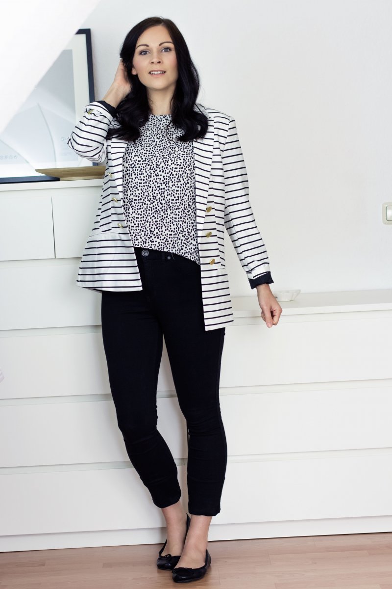 Mein zweites Highlight an diesem Outfit ist das gepunktete Top von Zara, natürlich in Schwarz-Weiß. An diesem Top konnte ich einfach nicht vorbei gehen, als ich es im Laden gesehen habe. Es gefiel und wurde prompt mitgenommen. Besonders schön finde ich, dass die Punkte auf dem Top unterschiedlich groß sind und nicht akkurat aufgedruckt. Das macht das Muster sehr lebendig und passt perfekt zum statischen wirkenden Streifenmuster des Blazers. Zur schwarzen Jeans muss ich nicht mehr viele Worte verlieren, sie ist nach wie vor mein Favorit. Ich würde sie am liebsten 24/7 tragen. An die Füße habe ich schwarze Ballerinas von Topshop gezogen – die beste Wahl bei dem unbeständigen Wetter der letzten Tage.