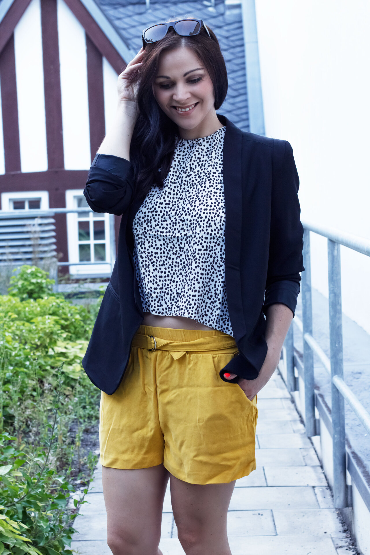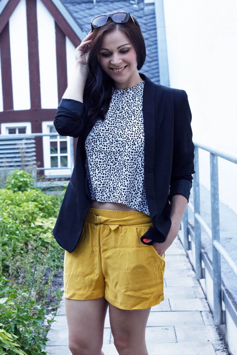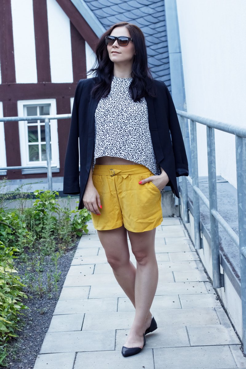 Zur gelben Hose und gepunkteten Top kombiniere ich einen Smoking-Blazer. Er greift die schwarzen Punkte des Tops wieder auf und verleiht dem Look eine Portion Extravaganz. Auch an den Füßen habe ich mich für Schwarz entschieden und trage meine neuen Leder-Ballerinas von H&M.