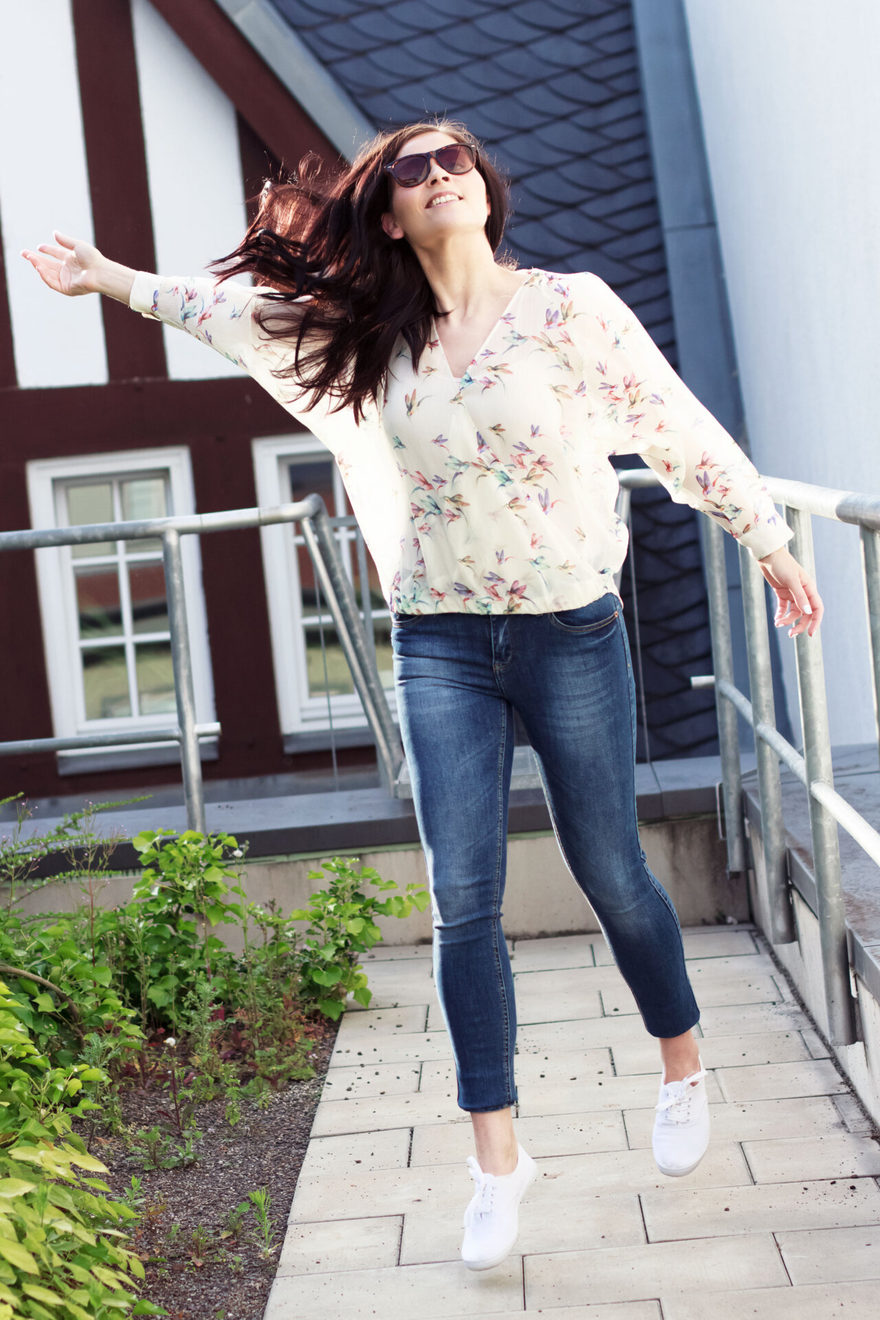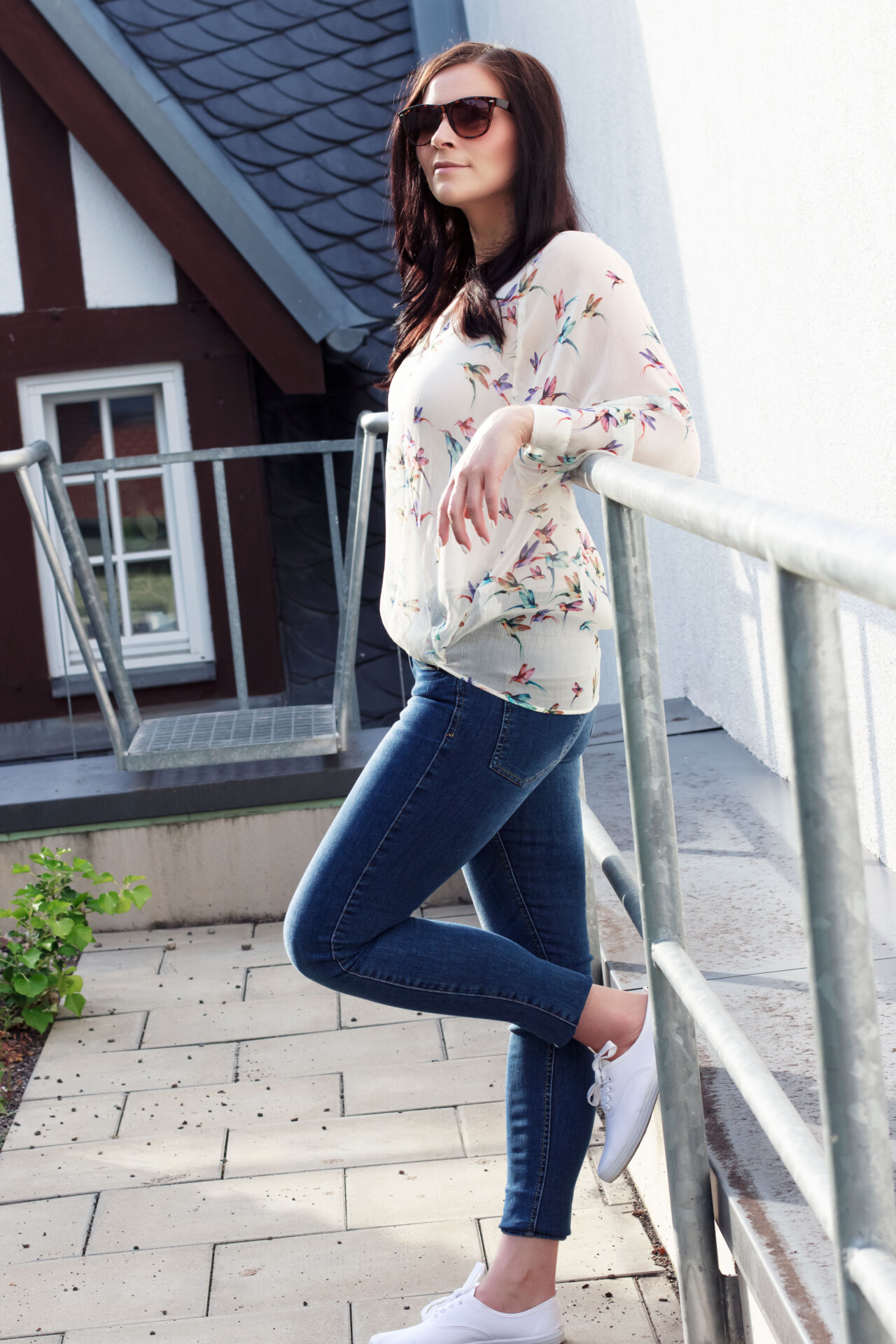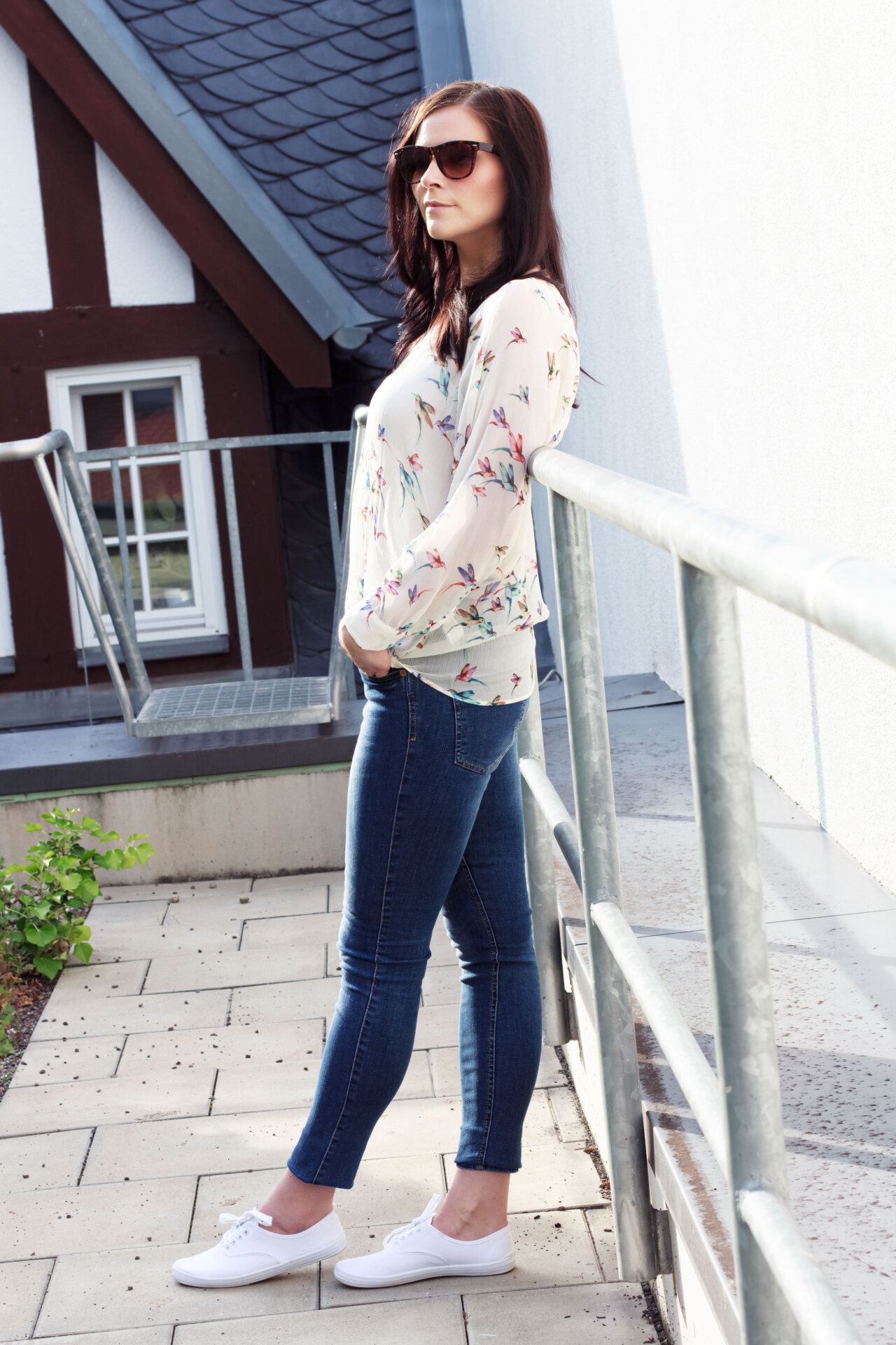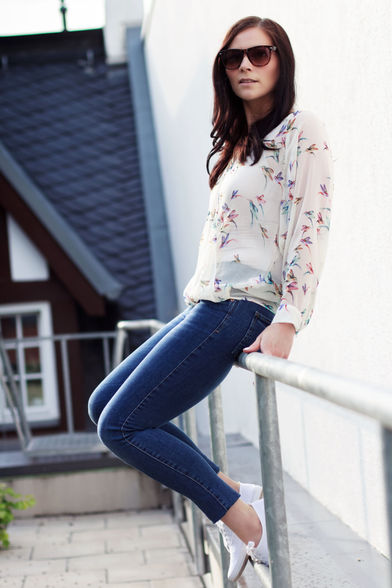 Im Alltag trage ich gerne mal Bluse, aber auch sehr gerne T-Shirt. Diesmal ist meine Wahl auf die Musterbluse mit sommerlichen Vogelprint gefallen, die schon viel zu lange unbeachtet in meinem Kleiderschrank hing. Es wurde höchste Zeit sie endlich mal wieder auszuführen. Weil die Bluse leicht transparent ist, trage ich sie immer in Kombination mit einen hautfarbenem Top. Super praktisch, denn es fällt so gar nicht auf, dass man etwas darunter trägt. Dazu kombiniere ich ganz lässig eine blaue Jeans von Gina Tricot, die ich fast so gerne mag wie meine heiß geliebte Jeans von Urban Outfitters. Meine Schuhwahl ist auf die weißen Sneakers von Primark gefallen, von denen ich nicht wirklich begeistert bin, wie ihr vielleicht wisst – aber darüber habe ich in meinem Summertime Sadness Look schon ausführlich geschnattert.