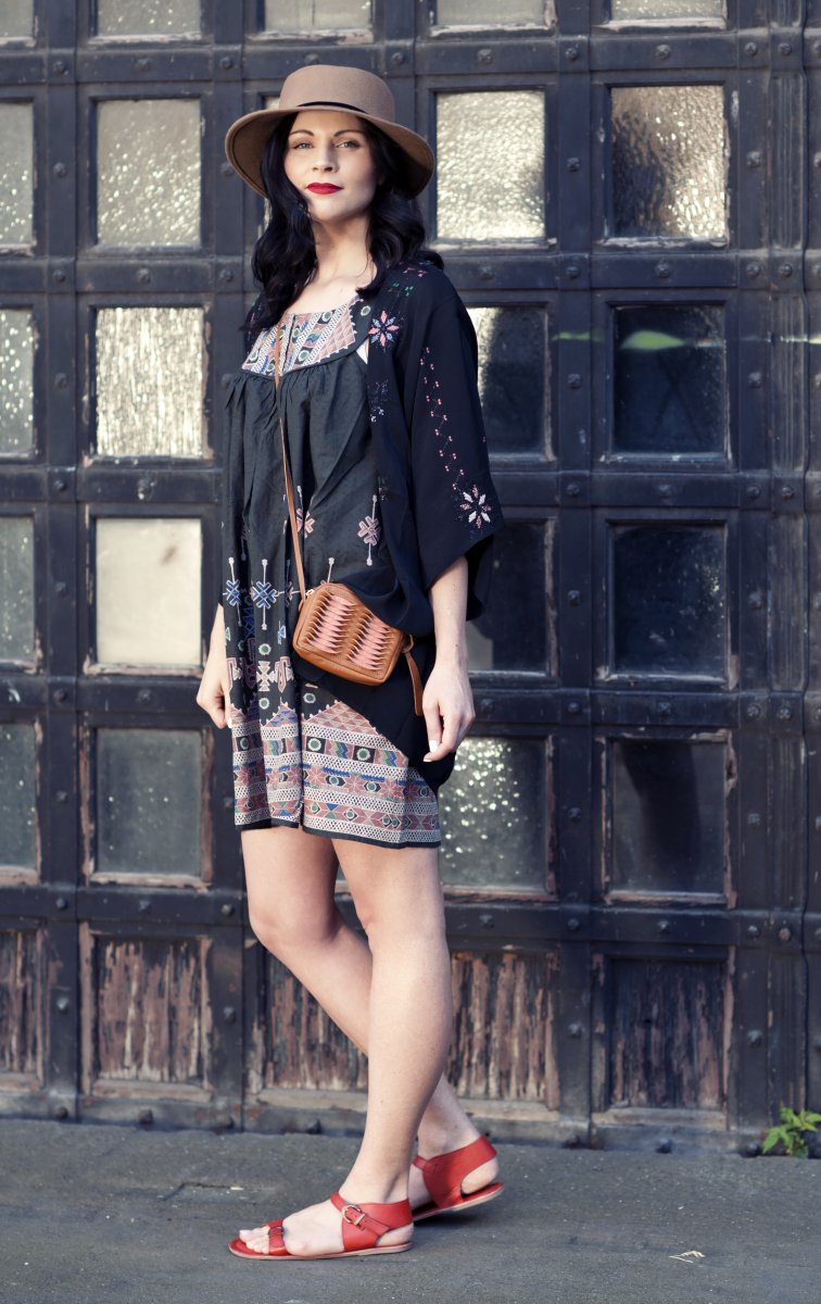 Ergänzt habe ich den Look mit einem transparent bestickten Kimono, einem caramelfarbenen Hut und einer kleinen Ledertasche. Als Eyecatcher wählte ich diese roten Ledersandalen aus. Ich finde sie runden den Look perfekt ab und greifen das Rot des Kleid noch einmal auf.