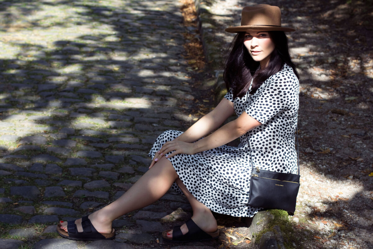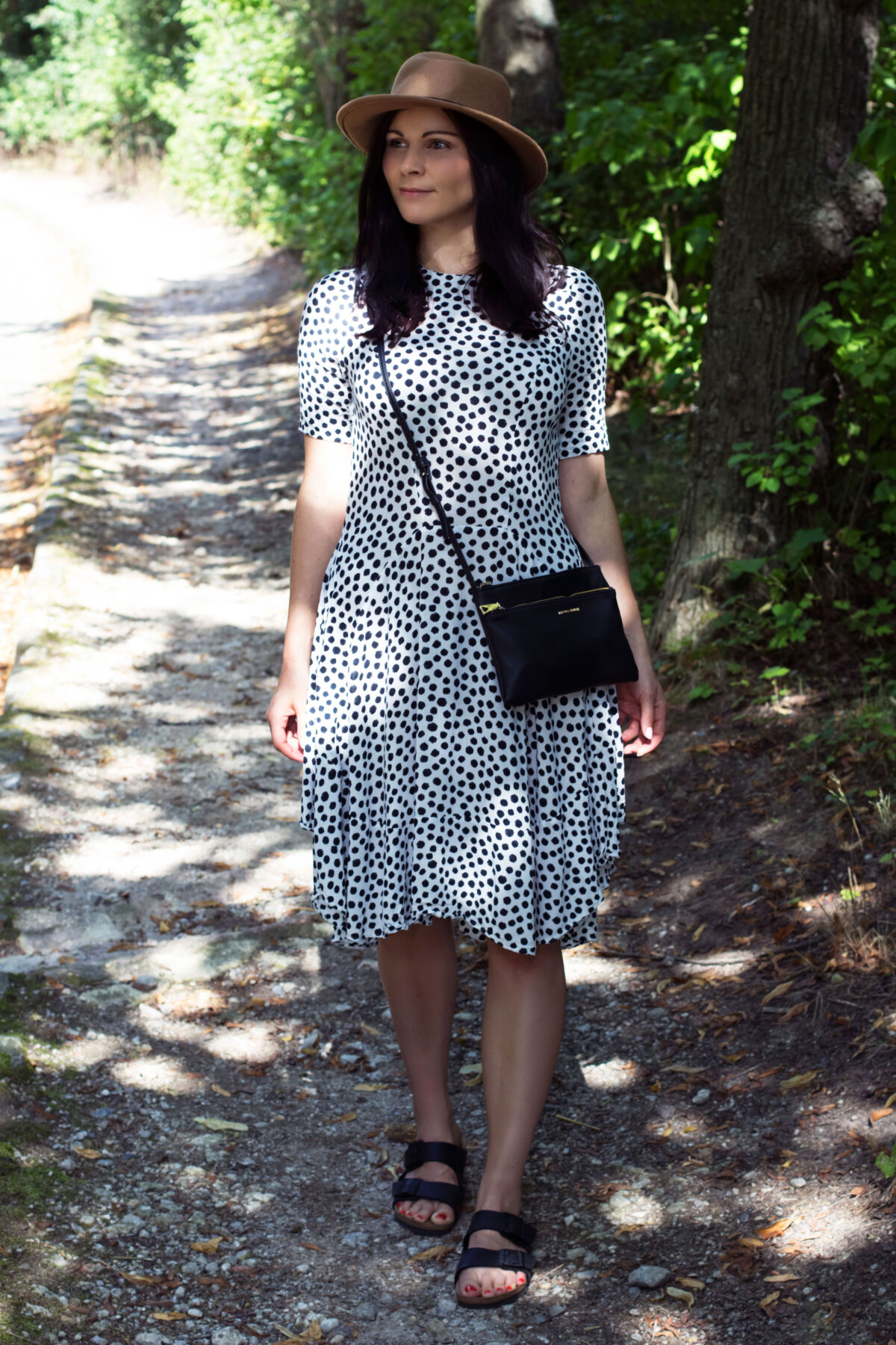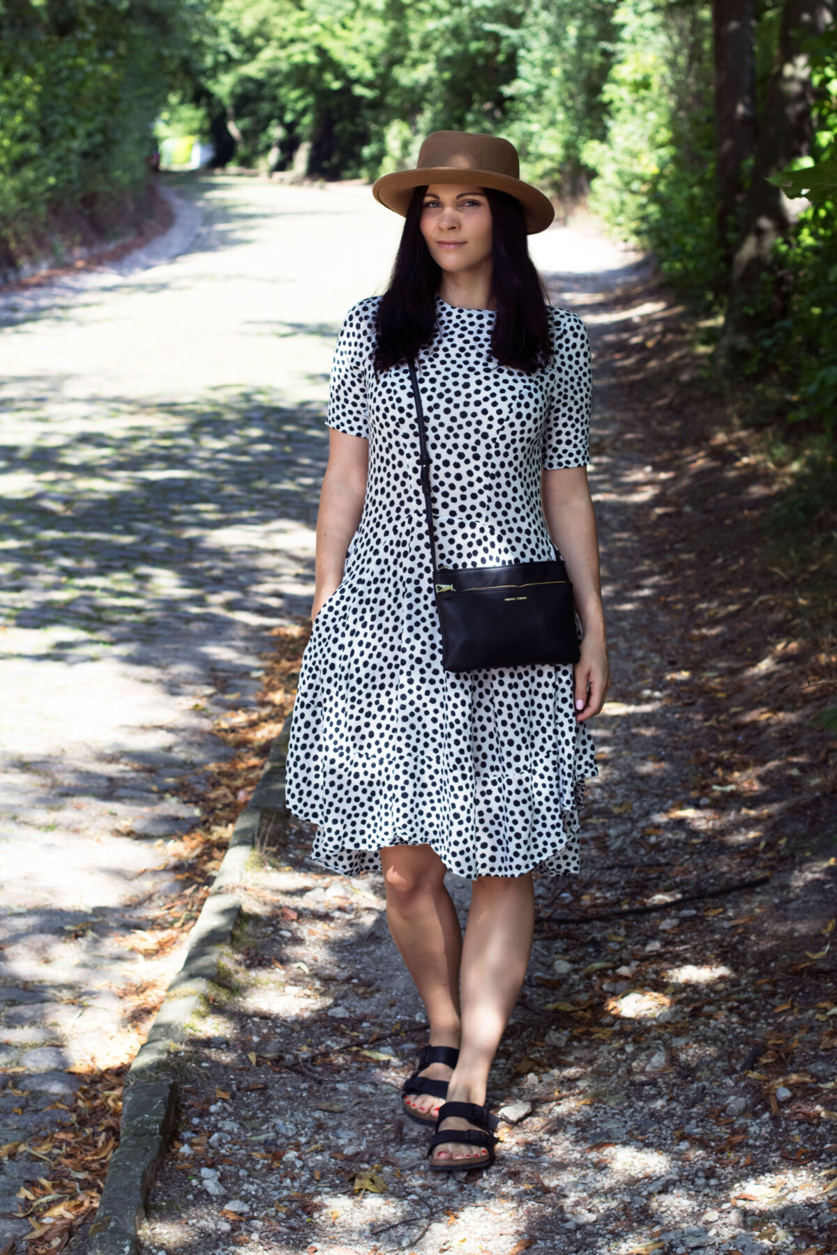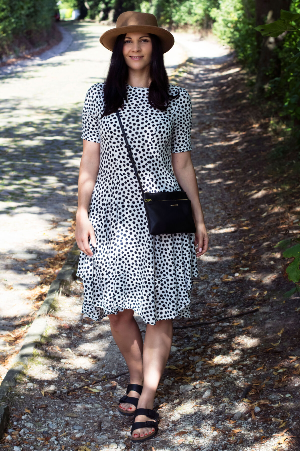 Tupfen, Kleckse und Punkte verdrehen mit derzeit den Kopf. Meine Leidenschaft für dies peppigen Prints präsentierte ich euch bereits in meinem Outfit „Schwarz-Weiss in den Herbst“. Damals als Top und heute in einem Komplett-Look mit Kleid. Als ich die schwarz-weißen Tupfen sah, war das Kleid bereits bestellt und kaum angekommen, konnte ich mich nicht mehr von dem eleganten Kleidungsstück trennen. Deshalb zeige ich euch zum Montag einen Look im Tupfenkleid.